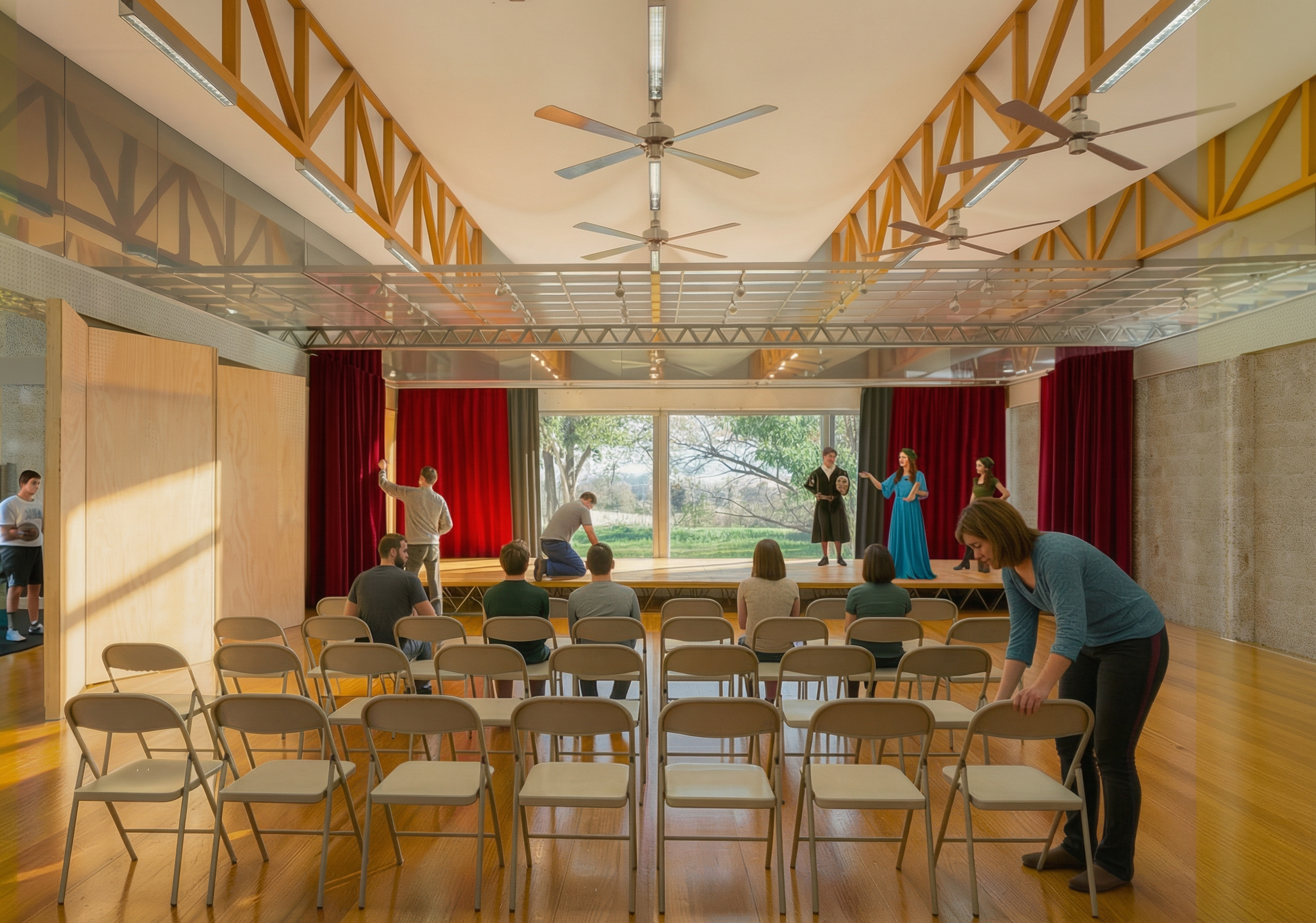 modern bedroom with a sleek sophisticated design feature a vibrant metallic blue sports car mural on the wall with dynamic motion effects the bed is upholstered in dark gray fabric with matching pillows and a textured throw blanket the floor is a warm light oak herringbone pattern soft diffused natural light filters through beige roman shades creating a calm and inviting atmosphere the walls and built in wardrobes are a clean crisp white with minimalist black handles add subtle lighting and shadow play for a contemporary stylish ambience