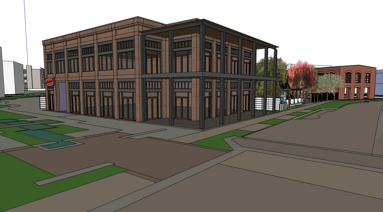 make this a photorealistic rendering at sunset with a restaurant on the first floor and hotel rooms on the second floor show railings for the second floor balcony show restaurant tables on the first floor patio show cars and people on the street in front of the building show heavy landscaping in the green areas