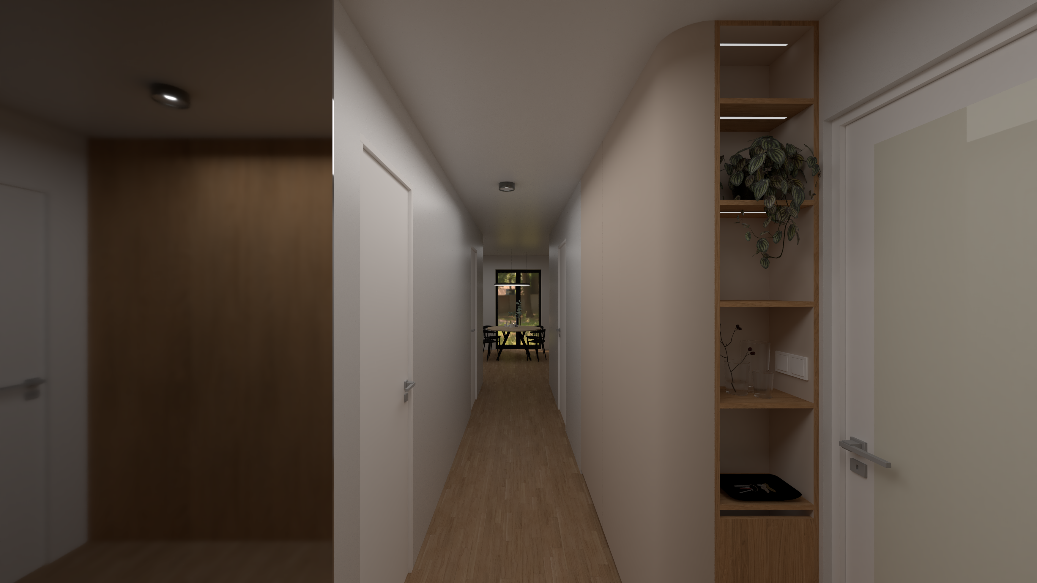 enhance this hallway interior to high end photorealistic quality while keeping the exact layout camera angle proportions and all furniture unchanged lighting significantly improve lighting to make the hallway feel brighter deeper and more inviting add soft indirect led lighting inside the open shelves warm 3000k enhance ceiling lighting with soft diffused illumination no harsh spots add subtle light gradient along the corridor to emphasize depth enhance natural light coming from the room at the end of the hallway materials improve realism of wood textures floor and shelving add natural variation and subtle reflections refine wall surfaces to a smooth matte finish soft beige white tones enhance cabinet surfaces to look clean premium and slightly reflective not glossy improve glass door realism with subtle reflections rendering quality completely remove noise and grain produce a clean sharp high resolution render enhance global illumination and light bounce