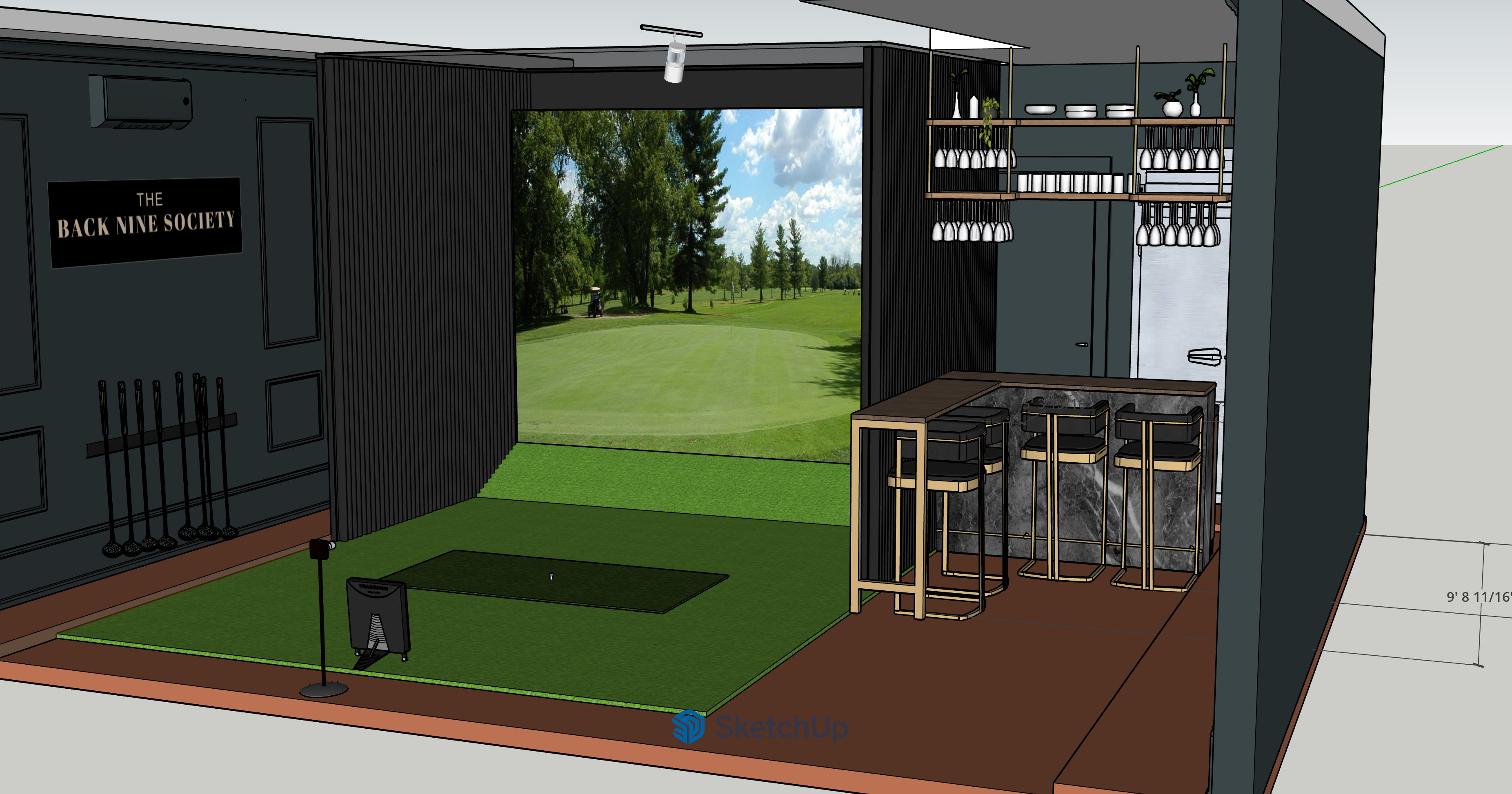 luxury moody esthetic golf simulation screen with faux golf grass in front the walls are painted with paneled moldings the bar is walnut wood top with brushed brass metal legs and marble face front there is a suspended shelving that stores wine glasses and glassware the floor is a finished cement in terracotta color the light source comes from the recessed lighting in the ceiling the golf simulation screen also is illuminated