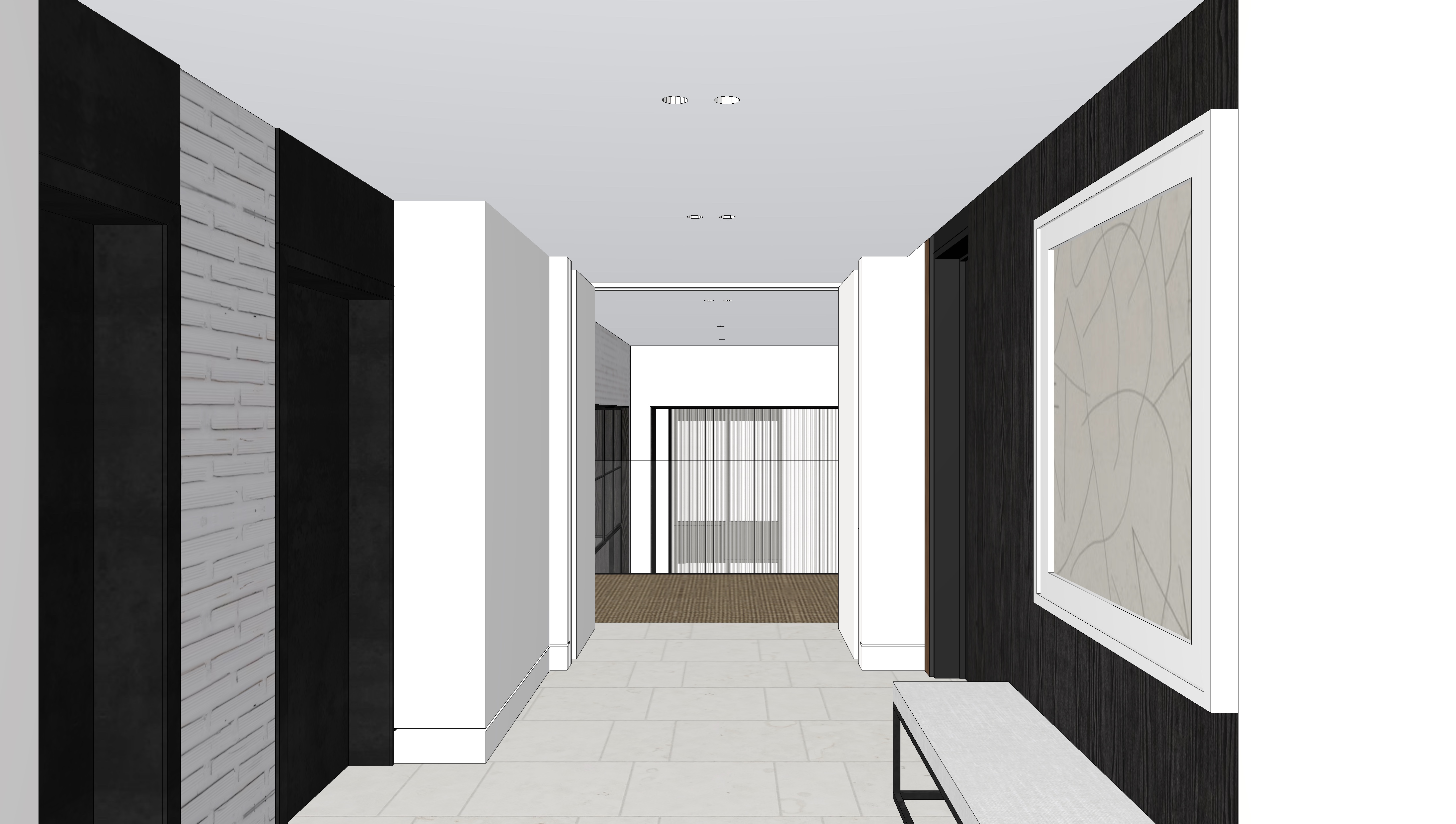 using the provided image as the exact base model create a fully photorealistic architectural rendering do not alter move redesign or reinterpret any architectural geometry wall placements ceiling heights openings millwork flooring layout artwork size or camera perspective maintain the exact viewpoint and proportions shown lighting render the scene in soft refined interior lighting conditions recessed ceiling downlights should emit warm diffused light 3000k with subtle realistic falloff on the walls and floor add a concealed linear led cove light above the framed artwork on the right wall the light source must be fully hidden within a minimal recess at the top of the frame washing light downward evenly across the artwork surface the glow should be soft continuous and uniform creating a gentle highlight on the art while producing a subtle vertical gradient of illumination on the surrounding dark wood wall no visible fixture or harsh hotspots natural daylight should softly filter from the glazing at the far end of the corridor diffused through sheer curtains creating depth and soft shadow transitions along the floor and walls materials finishes enhanced realism while maintaining original design intent right wall deep charcoal stained wood panels with subtle vertical grain and low sheen satin finish left feature wall light textured white painted brick with realistic depth and soft shadowing floor large format light limestone tile with fine grout lines matte finish subtle natural variation white walls and trim smooth painted finish with soft shadow gradients framed artwork crisp white frame with slight shadow reveal canvas texture subtly visible bench light upholstered cushion with refined fabric texture and black metal base atmosphere mood elegant calm contemporary residential corridor balanced contrast between dark wood and light stone soft ambient light with realistic global illumination natural shadow softness accurate material reflectivity and high dynamic range ultra realistic high resolution physically accurate lighting ray traced reflections subtle ambient occlusion professional architectural photography quality