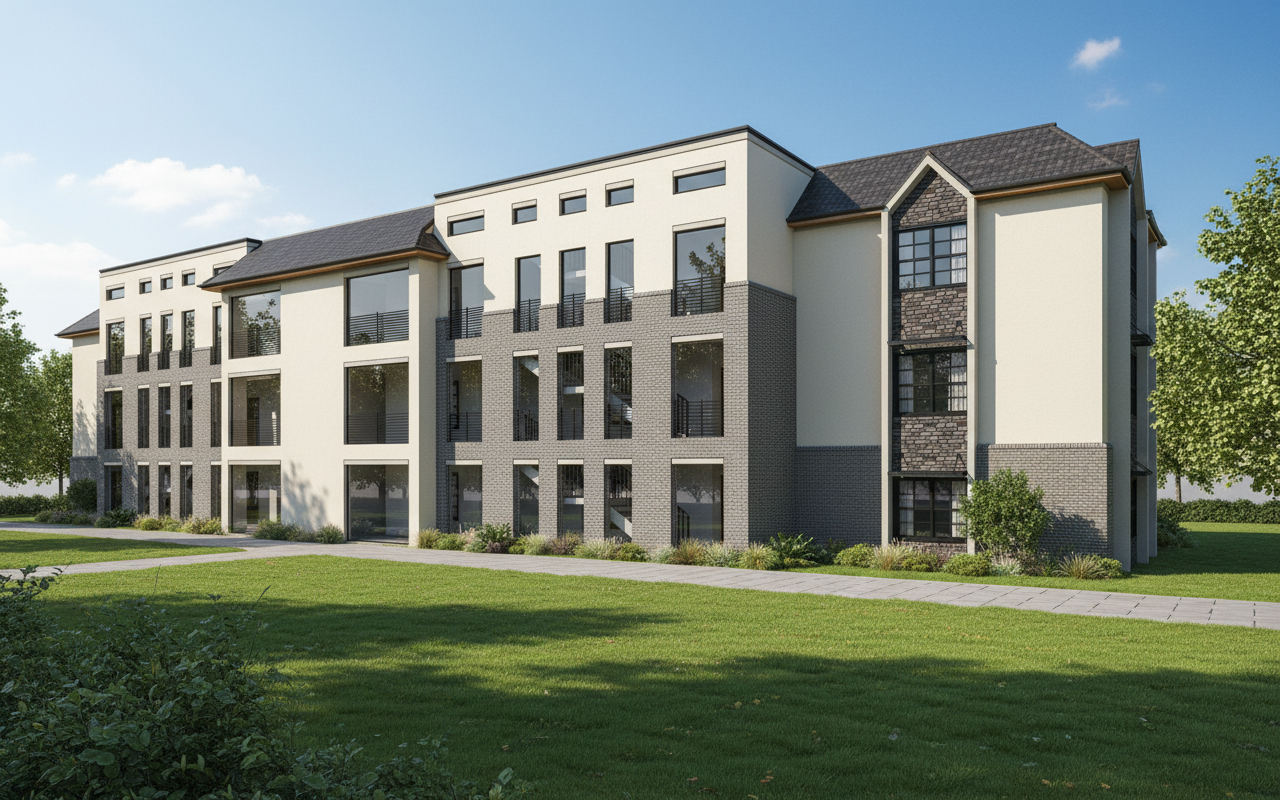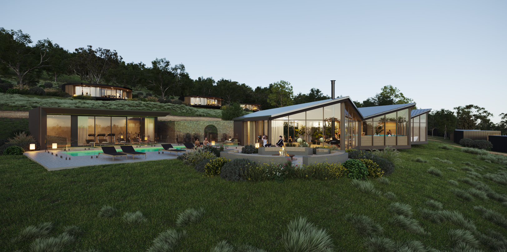 preserve building geometry and proportions harden edges to keep realistic do not redesign structure just complete areas needed to finalise design modern bathouse spa welness centre with internal spa saunas and ice baths dark burnt cladding black vertical charred timber cladding matte finish slim black aluminium frames concrete fire pit smoke and warmth coming from fire glazing should show tinted exterior reflections with subtle warm interior glow adapt colour natural warm tones inside dark tiles and microcement giving an ultimate welness experience freestanding spa in side see steam coming from it luxury villas in background dark charred timber black glazing to match earthy retreat landscape hierarchy low native grasses near villa only pathway lighting positioned evenly along path edge only no random scattered lights vineyard rows clearly in mid to far background distant tree line on ridge time of day late blue hour getting darker soft glaze soft sky gradient controlled lighting realistic shadow depth premium winery retreat mood negative no added furniture no dramatic spotlighting no suburban garden styling no cinematic overexposure