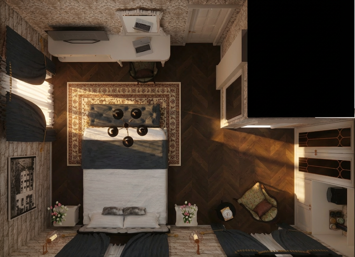 keep all existing details materials lighting textures and colors exactly the same as in the original design do not change anything in the overall composition style or atmosphere the only modification is to reposition the bed to the left side of the room left wall maintaining its original design size bedding and orientation consistency with the rest of the space