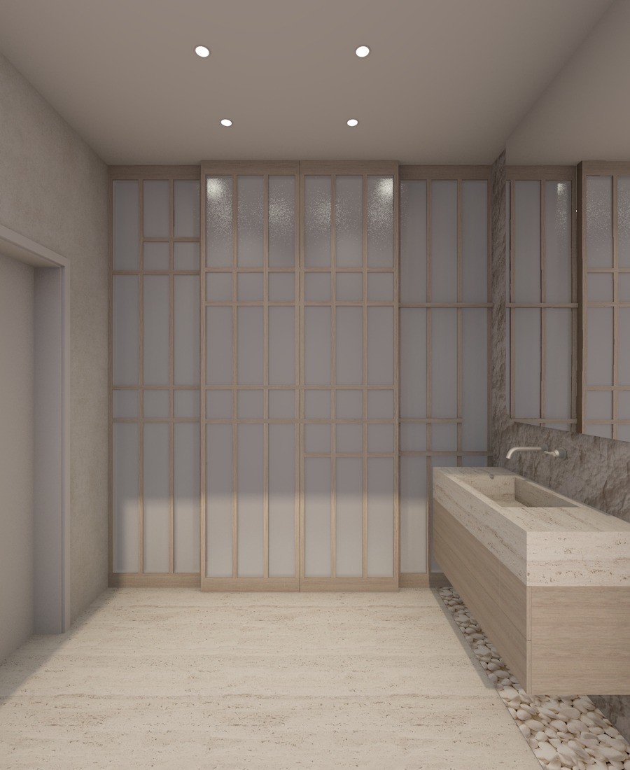 create a highly realistic render of a narrow bathroom corridor with a calm warm and refined atmosphere the design feels minimal elegant and high end with a soft natural palette and balanced lighting there are full height sliding doors with wooden frames and panels incorporating frosted glass the glass has a diffused translucent quality that softly obscures the interior at the end of the corridor there is a floating vanity the base is made of light natural wood with a minimal and clean design the countertop is in natural soft beige travertine with a subtle texture and matte finish the sink is integrated into the countertop and the faucets are wall mounted in a clean white finish below the vanity there is a recessed area filled with natural white pebbles adding an organic and spa like element behind the vanity the wall is finished with natural raw stone and a full width mirror enhances the depth of the space the walls are coated in light beige microcement and the floor is in a light natural stone tone the lighting is soft and diffused combining recessed ceiling spotlights with the natural light coming only from the right side creating a warm luxurious ambiance with gentle shadows ultra realistic render high resolution premium materials interior design magazine photography style