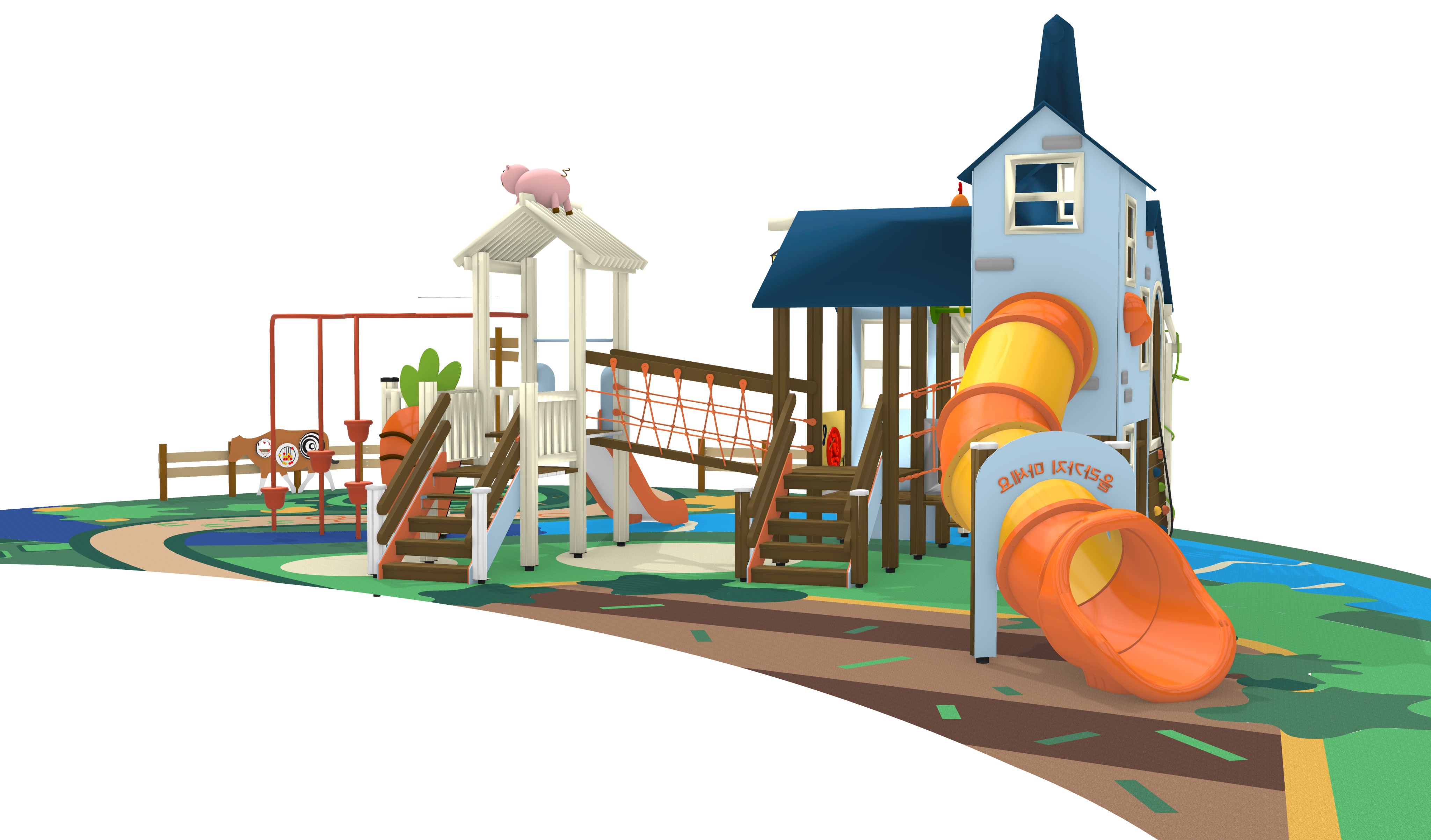 hyper realistic architectural render of a bustling outdoor children s playground area suitable for a luxury magazine feature do not add any playground structure or playground flooring other than what is given visual foundation composition the overall scene composition camera angle and surrounding outdoor elements like implied landscaping are inspired by singapore park outdoor environment details the setting is clearly outdoors with lush well maintained landscaping surrounding the playground this includes tasteful trees and shrubbery that frame the scene without obstructing the playground the ground beneath and around the playground should be appropriate for an outdoor play area e g safety surfacing grass vibe lighting liveliness the lighting replicates a vibrant day time with warm directional light primarily from the side creating rich highlights only making soft shadows no harsh shadows accepted the scene is exceptionally lively and bustling populated with a greater number of diverse children actively and dynamically playing on and around this specific playground model climbing sliding interacting adults are also present supervising or engaging in relaxed interaction within the well landscaped area the atmosphere is highly energetic happening and refined all materials and textures wood metal safety surfacing foliage building facades are rendered with a 4k uhd level of hyper realism and tactile quality matching the previous luxurious aesthetic output quality the final image should be clean free of watermarks and convey a premium aspirational quality