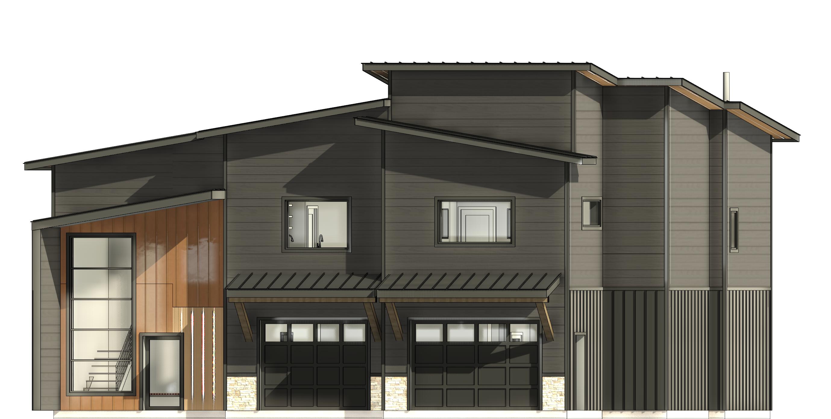 a modern two story home with a combination of lp smartside horizontal lap siding and lp smartside board and batten both in benjamin moore silhouette westform prolok vertical metal in ponderosa color on front door entry wall stacked stone 3 high around the garage doors in a light complimenting color black standing seam metal roofing exposed natural timber beams supporting both garage roofs retain the exact structure window arrangement beams rooflines height and proportions exactly as shown in the reference image add a smooth concrete front driveway extending toward the house garage doors and a walkway from the driveway to the front door and the side garage door bronze tinted reflective windows enhance materials and colors keep exact window structure arrangement beams rooflines and proportions exactly as shown in the reference image soft interior lighting inside the home creates warmth the home in the distance is a gold course around the property is mixed evergreens and hardwoods place the sun behind the trees so warm golden sunlight beams through the branches casting soft rays and subtle dappled highlights across the front of the home create ultra realistic lighting crisp shadows detailed textures in the wood and glass reflections and a vibrant clear sky with light atmospheric depth render in hyper realistic architectural visualization quality 8k resolution