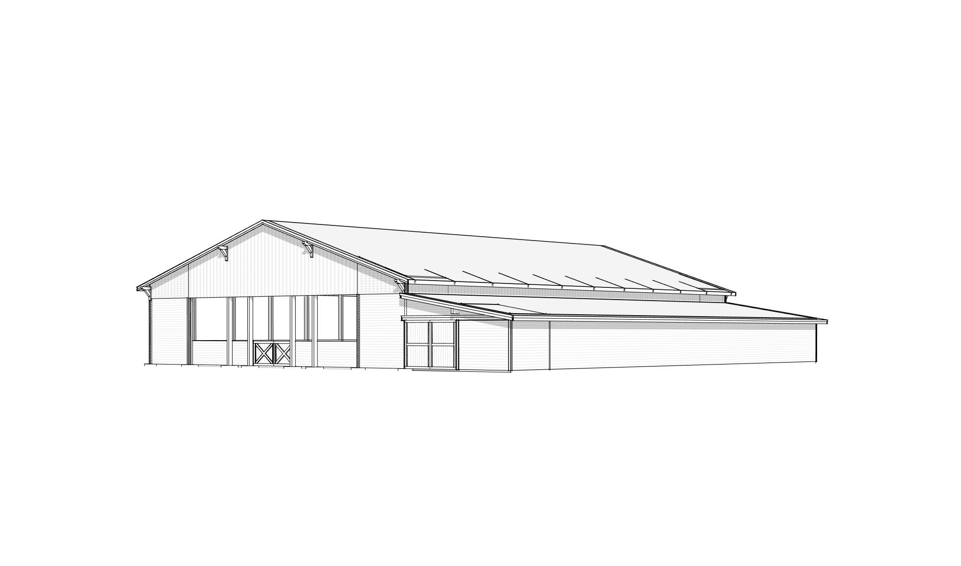 clean equestrian arena architectural open air exterior arena rendered in cinematic vibrant golden hour lighting with blue skies and vibrant clouds open air horse arena in a lush beautiful forest setting with green grass and dense trees surrounding the property select grade horizontal cedar siding on the lower part of the structure and douglas fir board and batten on the upper portion of the arena green manicured landscape around structure with gardens and grass black standing seam metal roof high fidelity photorealistic visualization crisp shadow falloff refined facade geometry soft atmospheric depth premium architectural photography mood ultra clean composition and materials photorealistic render prominent trees scattered around the property black posts black trim around wood barn doors no windows the arena is open air
