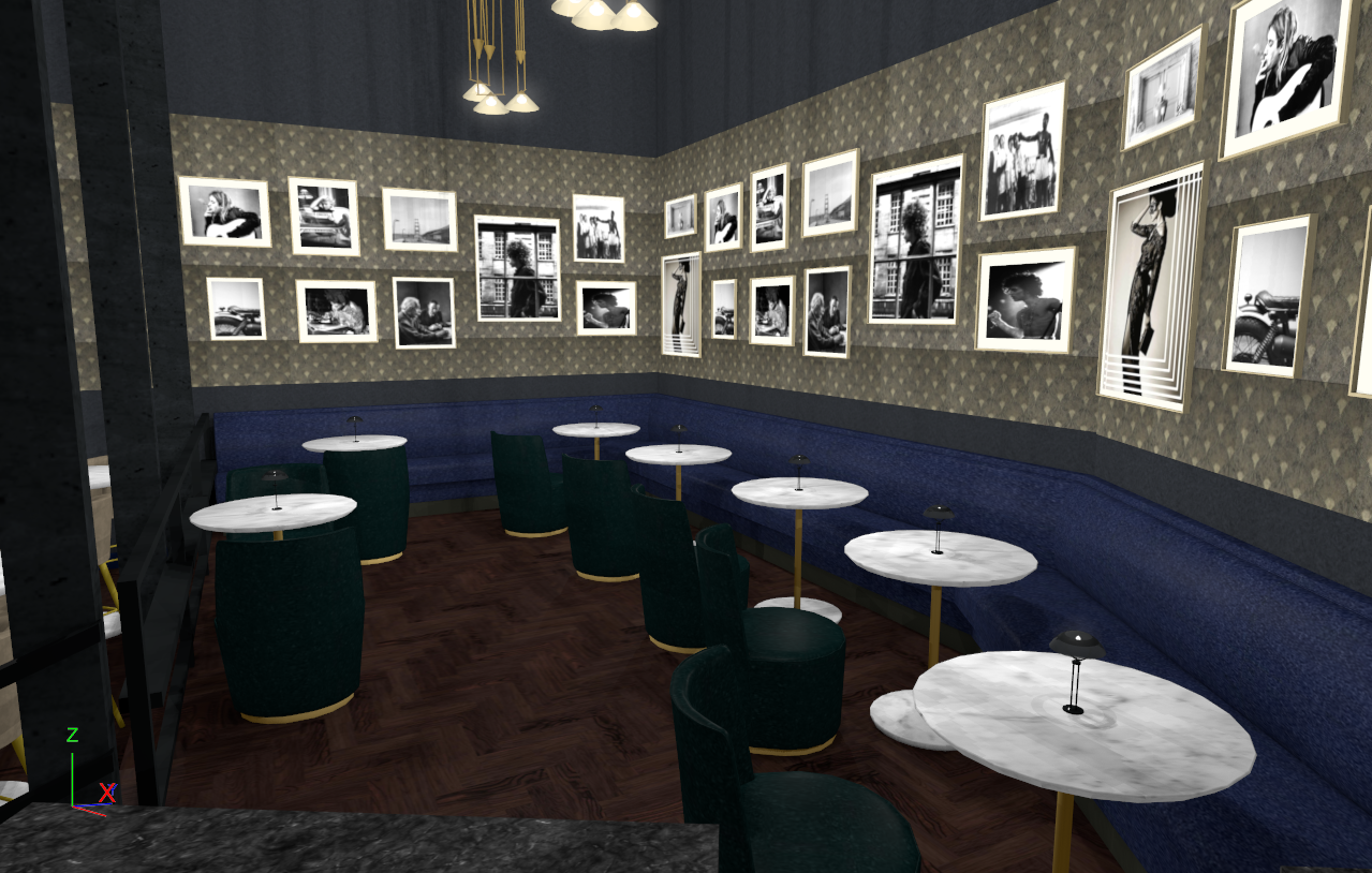 create a moody lounge with dim lighting the long blue velvet booth and dark green velvet chairs create luxurious seating the artwork on the walls is all black and white photography the walls are adorned in art deco inspired wallpaper with a black background and small gold fans the tables are white marble tops and brass bases the floor is dark wood in a herringbone bone pattern small table lamps provide a subtle glow brass and glass pendants hanging down from the ceiling offer a warm glow