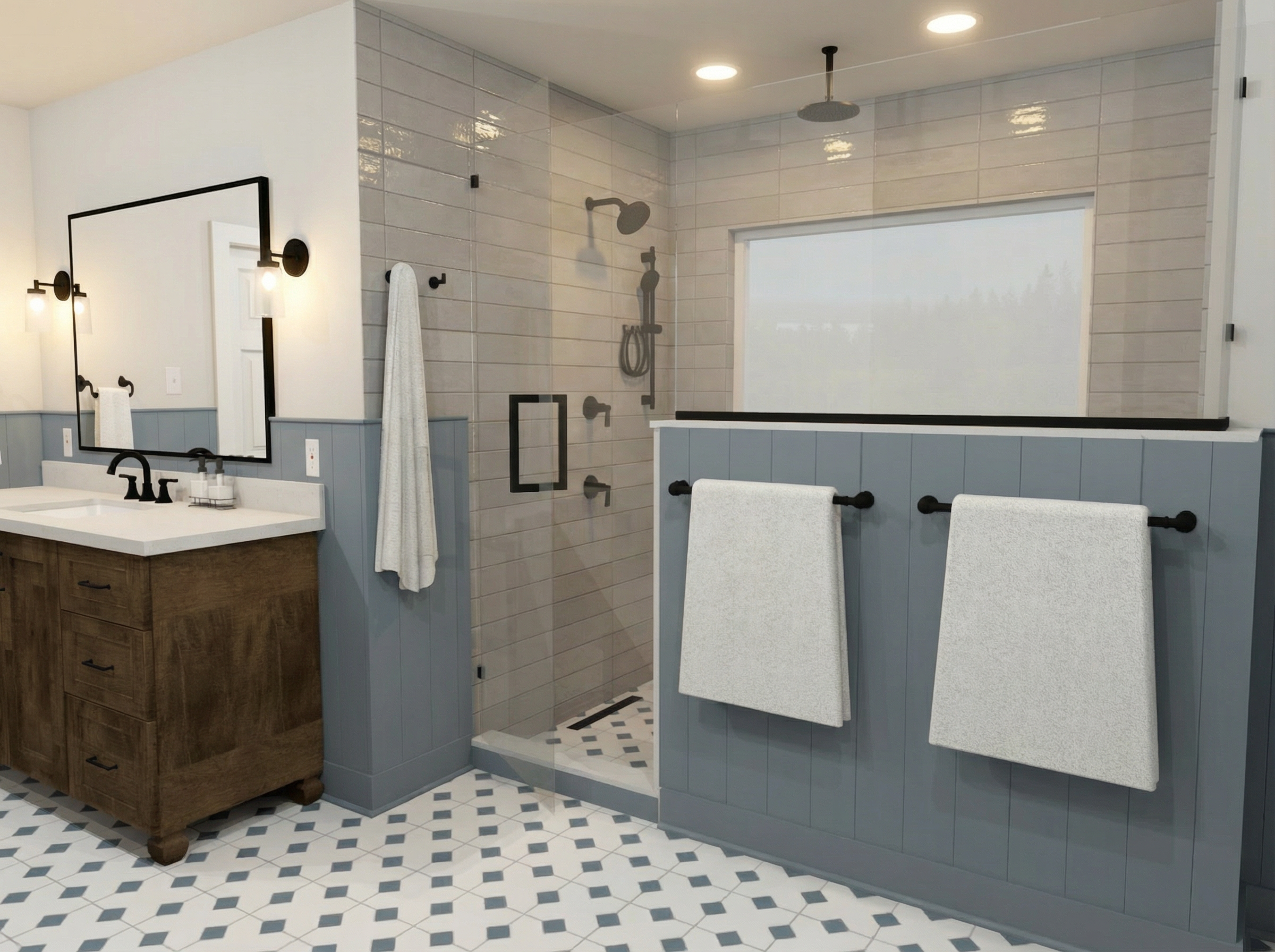 crea un render fotorealistico a partire da questa vista e una camera da letto sulla destra ci sono armadiature moderne a tutta altezza sulla sinistra c un letto comodo con testiera alta e due comodini moderni sopra ai comodini pendono due lampade moderne il soffitto in travi in legno a vista il pavimento un parquet a spina ungherese