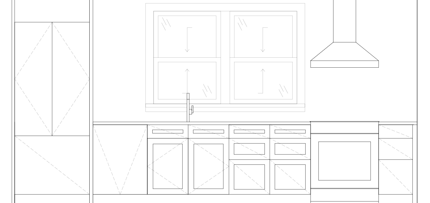 render this elevation all cabinetry will be stained dark green with the grain visible round knobs centered on drawers stainless countertops and stainless backsplash black dishwasher place an articulated arm sconce centered on the wall to the left of the windows walls are soft white