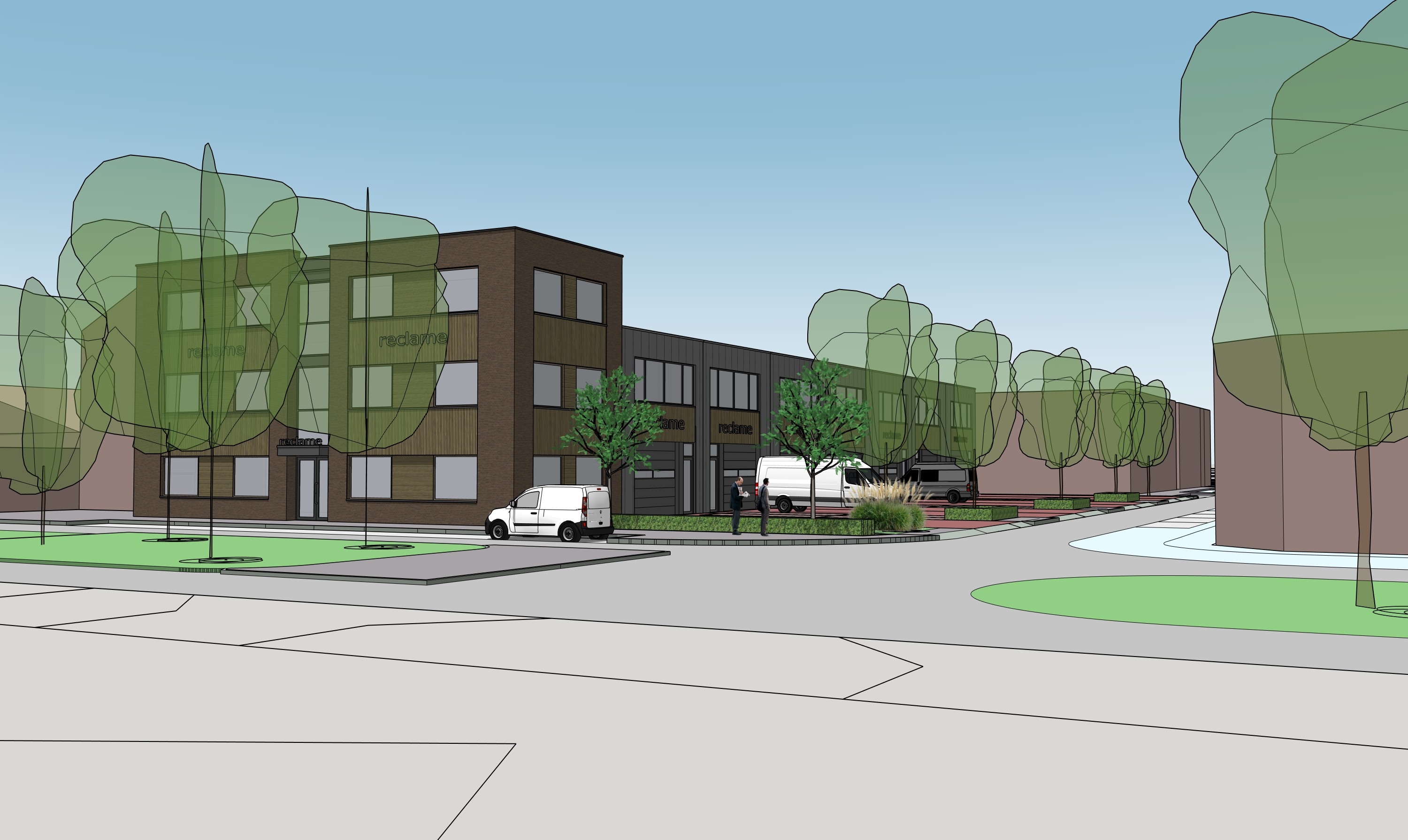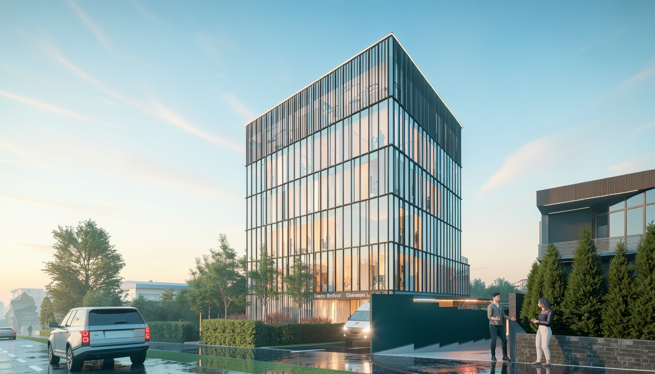 the weather is sunny with a few clouds in the sky add some people and cars arund the building behind the glass of the building there are some offices visible