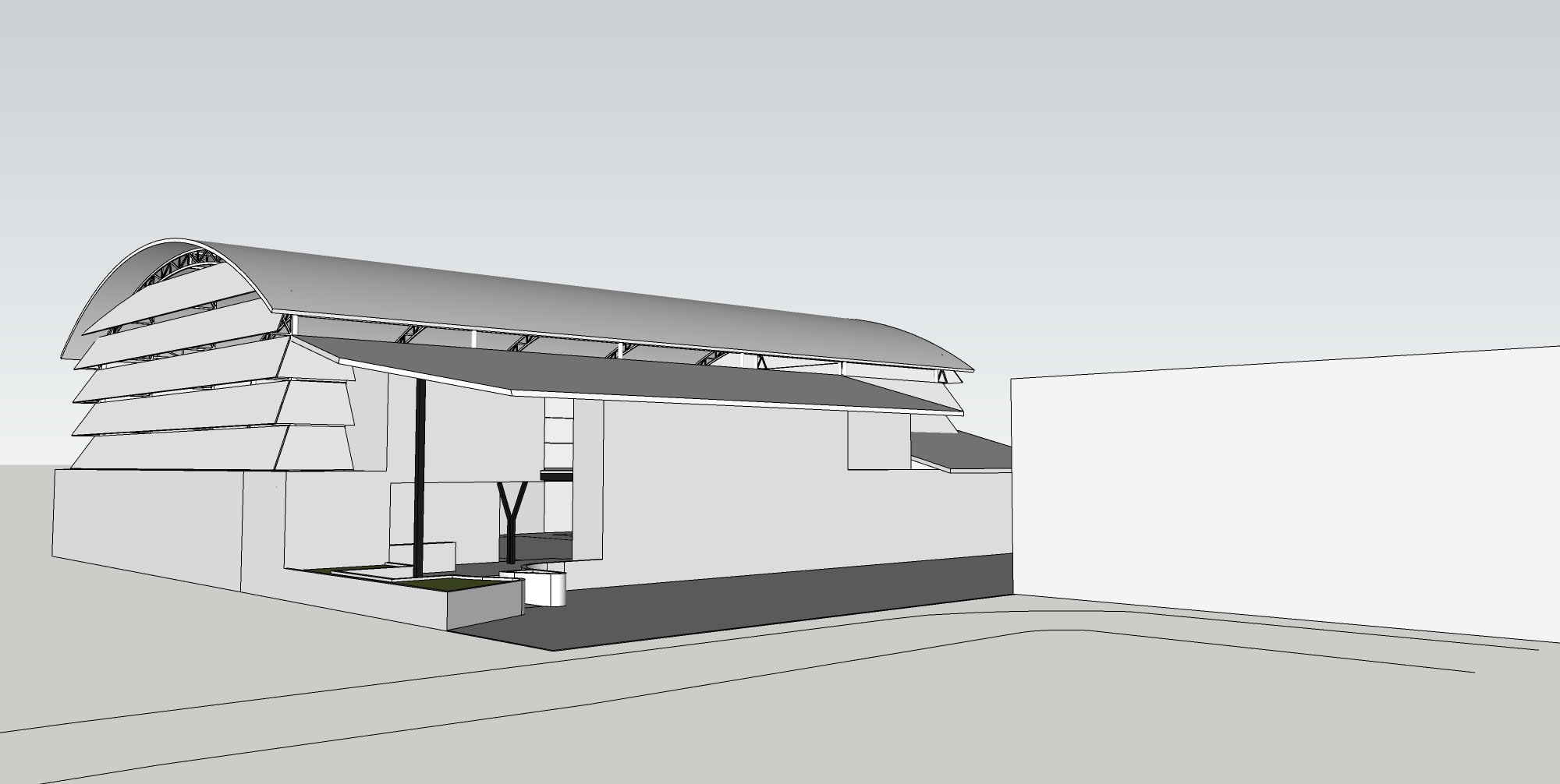exterior shot a modern architectural sports hall with a sleek curved roof made of cream pvc the walls are concrete complemented by large glass windows reflecting a bright sky the base of the building is in matte charcoal gray adding contrast surround the building with lush green grass and a few minimalistic sculpted trees set the atmosphere with soft natural daylight casting gentle shadows and a clear blue sky with fluffy white clouds