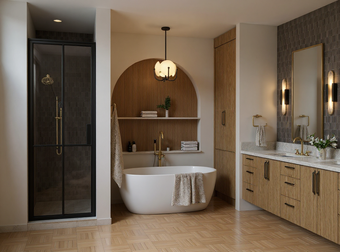 a three story mixed use brick building with a refined urban boutique hotel aesthetic red brown old world brick fa ade with evenly spaced arched window headers black steel framed windows and traditional black shutters ground floor features a restaurant with full height glass storefront windows and a recessed entry add black metal awnings and green caf umbrellas over outdoor seating include subtle classical details such as brick arches horizontal limestone bands and decorative cast iron grilles below the windows render in a clean modern street setting with soft morning light neutral skies realistic shadows and high end photographic quality balanced composition straight on elevation view no distortion crisp materials ultra realistic lighting natural reflections on windows