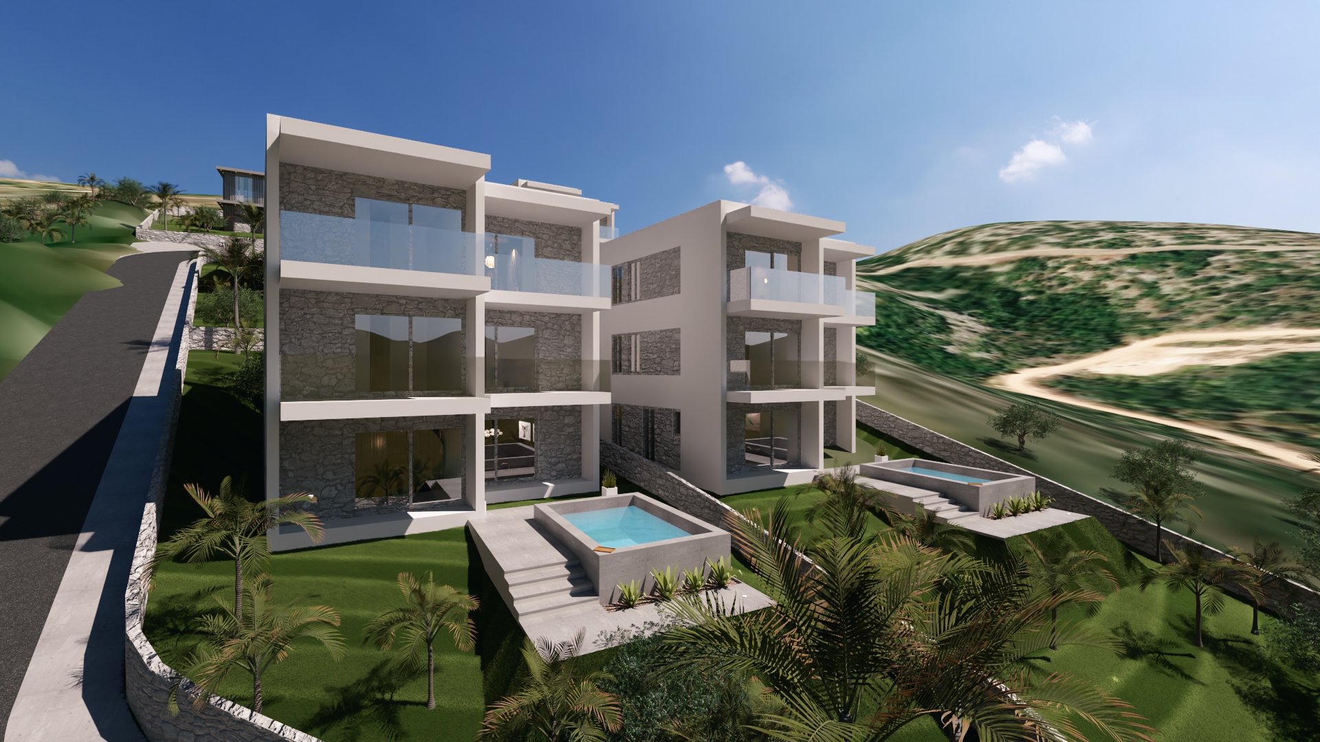 add surounding mediterranean landscape with stone walls and olive trees