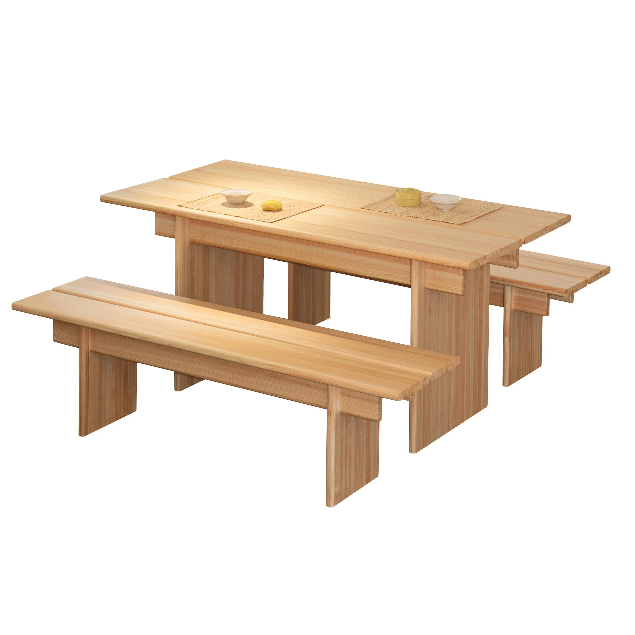 replace the current plain white background with a warm cozy modern dining area in a bright home interior use soft neutral wall tones such as warm beige with light wooden flooring to create a cozy premium home atmosphere keep the dining table set table and benches in the exact same position angle scale and perspective as the original image do not alter the furniture s design dimensions proportions structure wood grain color texture or orientation in any way