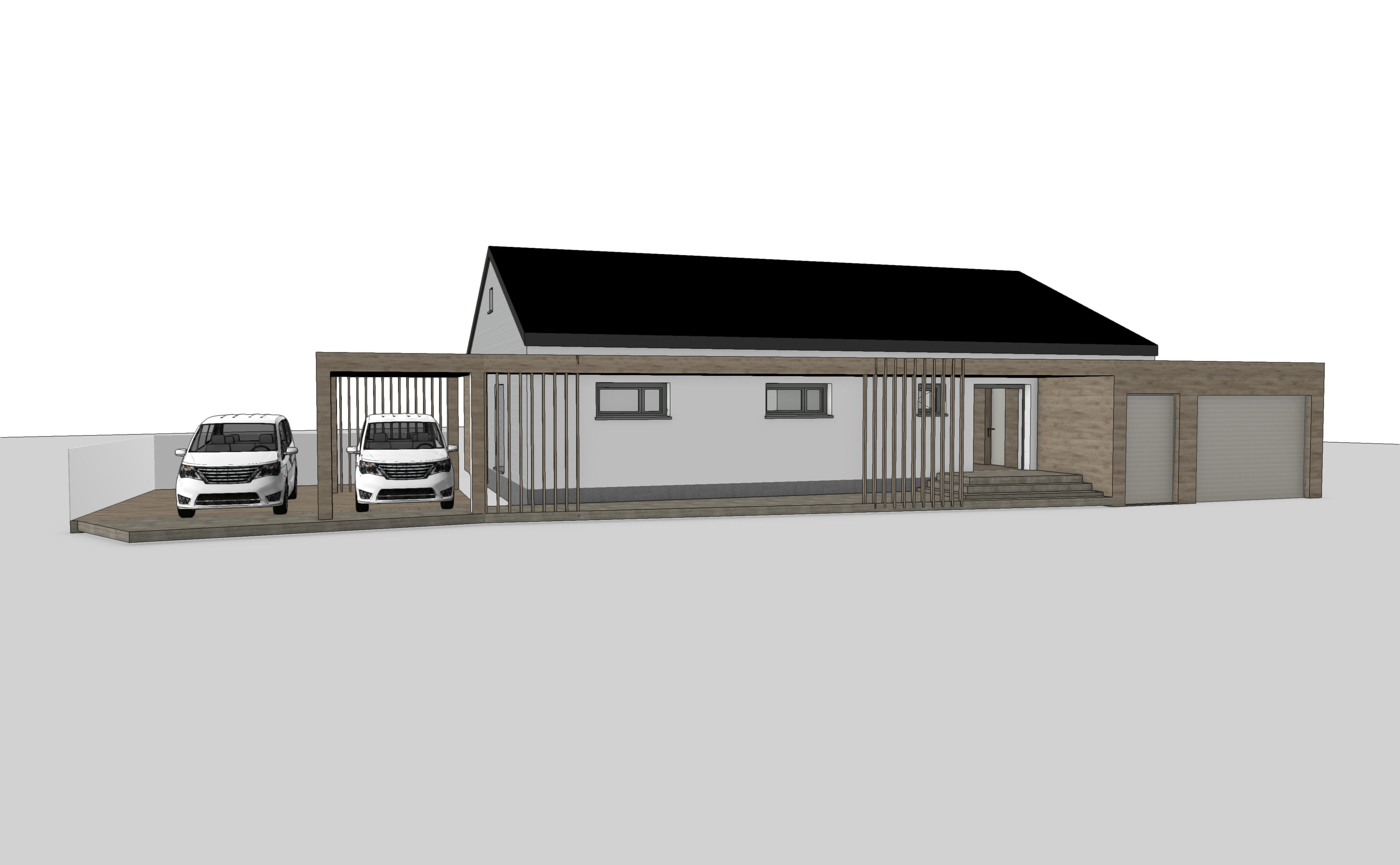 erstelle mir eine hochwertige au enansicht des einfamilienhaus im schlehenweg 12 in bad neustadt es soll eine kombination aus holzfassade und heller putzfassade sein das geb ude steht am hang das erdgeschoss ist ebenerdig zug nglich es gibt keinen b ume um das geb ude es ist ein offenes grundst ck mit guter aussicht vor dem haus ist eine stra e mit zufahrt zur garage und zum carport