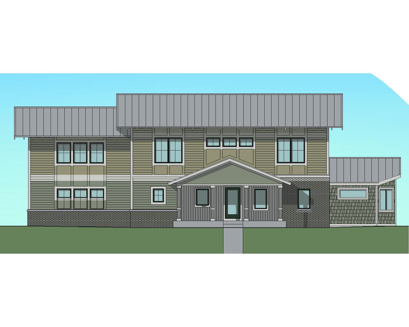 create a beautiful photo realistic rendering of the front elevation of this house provide nice landscaping with a bright mid day sky with puffy clouds the feeling should be cozy and welcoming