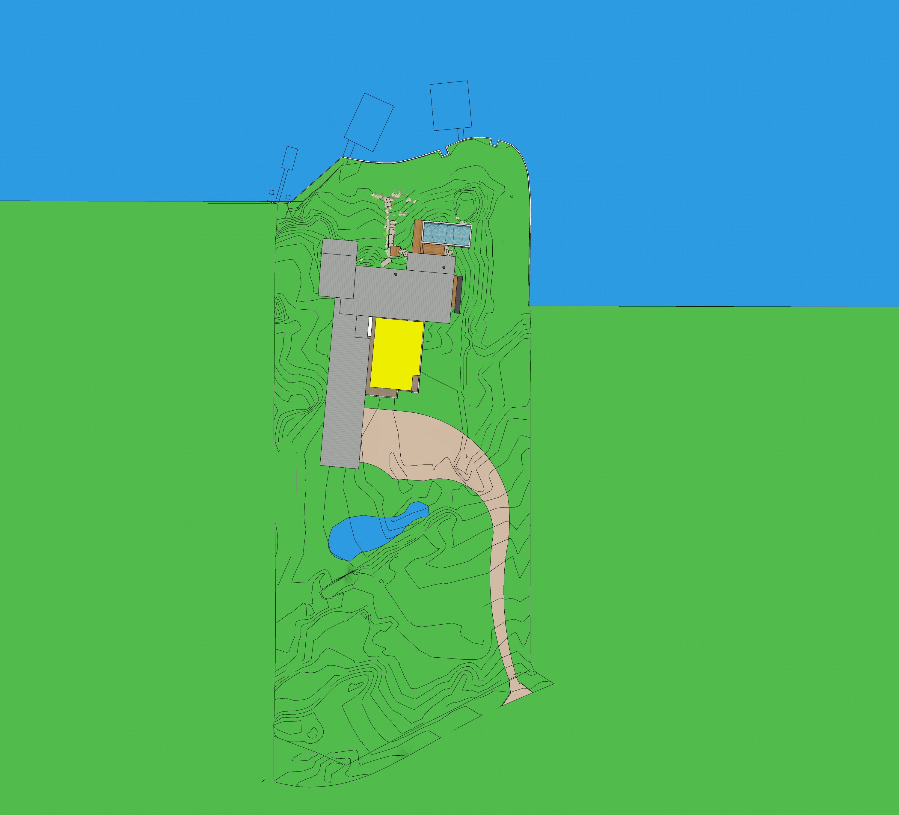 create a photorealistic birds eye view site plan rendering top down high oblique drone view choose whichever matches the reference match the reference image exactly for camera framing tilt crop horizon height if visible and scale keep clean verticals no keystone stable horizon if present and no fisheye site color key must match reference yellow areas grass lawn mown healthy slightly sun faded late summer tone brown areas brown gravel driveway angular gravel texture realistic compaction subtle tire patterning if shown smaller blue shape natural pond irregular natural edges shallow to deeper gradient natural coloration context location contemporary lakehouse on inks lake texas hill country keep all site geometry and relationships identical to the reference shoreline bulkhead line dock walkway tie in boathouse position house position and any terraces paths shoreline water match reference lake occupies the portion of the frame consistent with the reference plan view water body shape must match exactly calm blue green water at normal level with gentle wind ripples and realistic reflections where visible from above shoreline has a concrete bulkhead with low native grasses immediately above it retain exact bulkhead geometry and alignment architecture do not alter retain the exact structure from the reference window arrangement rooflines foundation height proportions two story portion is a screen porch keep its openness and scale exactly as shown materials white stucco siding light gray standing seam metal roofing exposed timber rafter tails accurate glazing with realistic reflections no warped fenestration dock boathouse boat include a boathouse connected to the shore via a dock walkway tied into the bulkhead exact placement per reference place one boat in the water near the boathouse floating naturally with minimal disturbance small ripples consistent with calm conditions keep relative position consistent with the reference topography planting use reference topo lines use the topo lines from the reference to build an accurate site behind the bulkhead no smoothing no reinterpretation minimal site disturbance native drought tolerant hill country landscaping and natural pathways planting scattered live oaks ashe juniper dry golden grasses with occasional green pockets prickly pear accents only where consistent with the reference lighting atmosphere render quality lighting late summer afternoon sun position top left shadows cast bottom right physically accurate direction intensity subtle atmospheric depth warm haze over distant low hills if visible hyper real architectural visualization high micro texture detail stucco metal seams wood grain concrete bulkhead gravel balanced hdr crisp edges crisp shadows vibrant clear sky if included output 8k photoreal render plan site emphasis no diagram styling not flat vector realistic materials and light