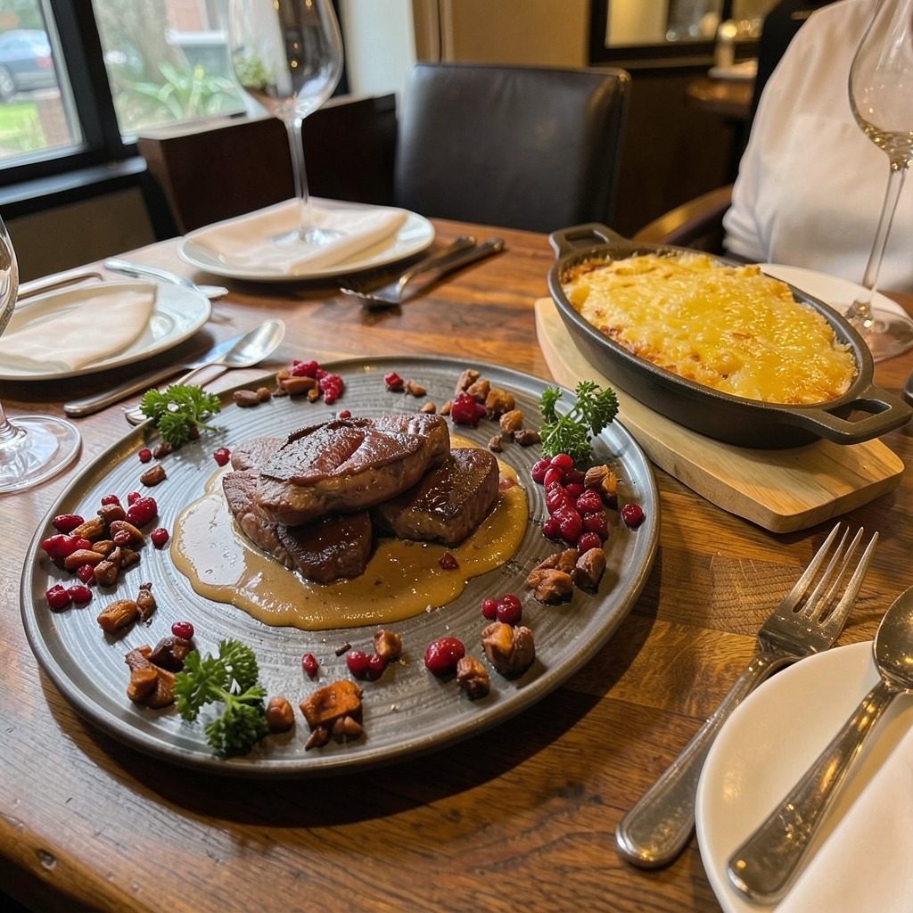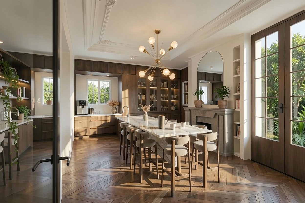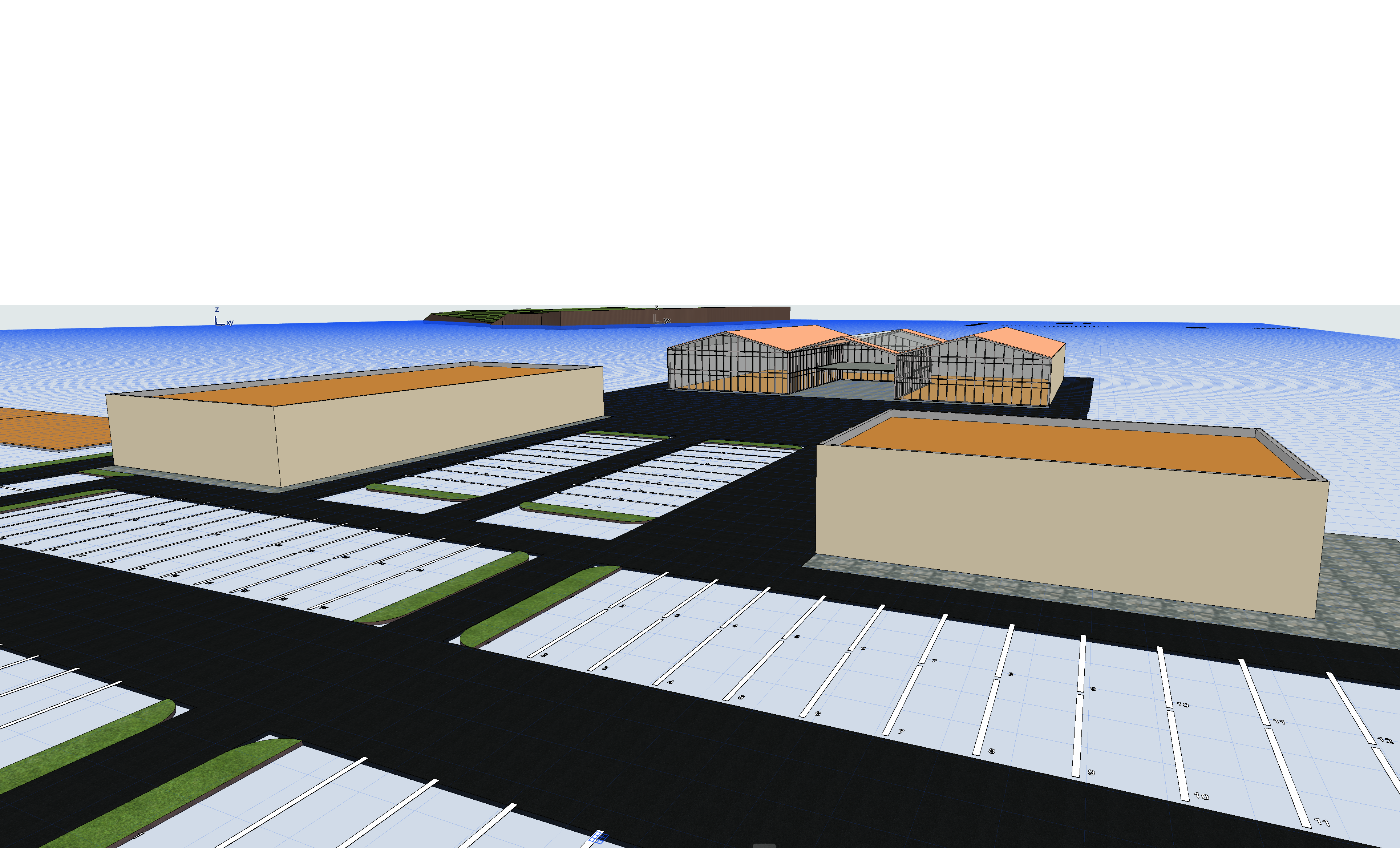 photorealistic architectural render of a commercial masterplan development preserving the exact building geometry and layout from the reference model the scene includes three main volumes a commercial gallery building in the background with large glass fa ades and an open central passage a fast food drive thru building on the right a large hypermarket building on the left the camera is positioned at a slightly elevated eye level perspective showing the parking areas and circulation clearly important constraint maintain the original massing proportions and placement of buildings roads and parking layout enhance the environment with rich realistic landscaping and greenery add rows of medium height trees along parking aisles and roads introduce planted islands with grass shrubs and low bushes between parking spaces soften hard edges with green strips and curbs integrated into the parking layout include decorative planting around building entrances the parking area should be realistic asphalt with markings slightly worn with clear white striping add cars parked in some spaces for realism the commercial gallery should have transparent glass fa ades with visible interior activity and the central passage should feel open and inviting the fast food drive thru should include subtle signage drive lanes and a canopy while the hypermarket remains a large clean commercial volume with minimal branding add pedestrian pathways benches and small urban elements integrated into the landscape lighting natural daylight soft shadows slightly warm tone realistic sky materials glass curtain walls metal panels concrete asphalt greenery with varied tones style contemporary commercial development realistic urban planning visualization rendering quality high end photorealistic architectural visualization global illumination realistic vegetation soft shadows atmospheric depth