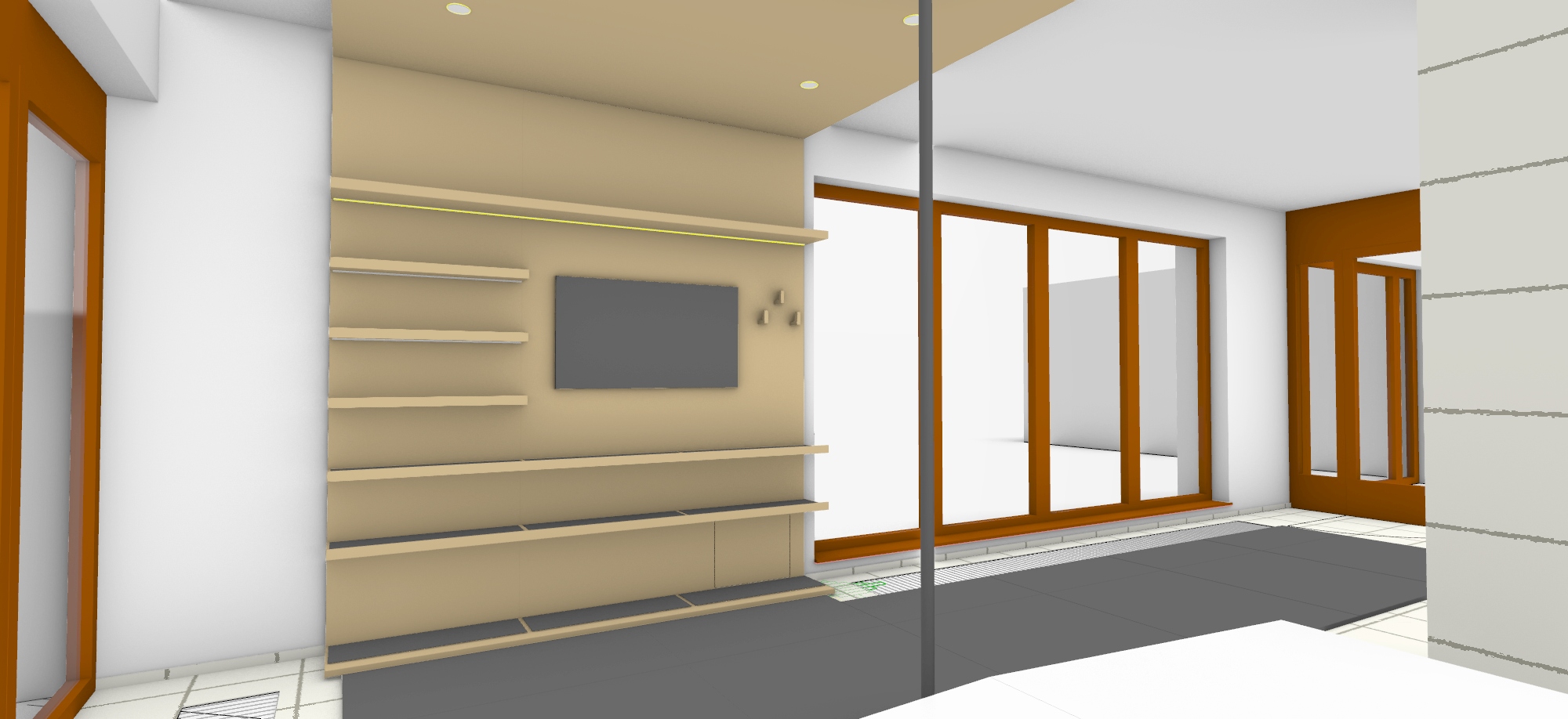 visualization of home fitness do not change any proportion the window frames brown wood new wall panel with shelves for fitness staff oak matt ceiling stright next to the panel oak creating c shape form of the wall panel put fitness staff on that oak panel wall on the right side put some small kettlebels on lower shelves 2 towels above 2 jogamats rolled on shorter shelves next to the tv hang 1 jumping rope on hang on the right side of the flat tv make ambient light there is soft led lights under the shelves on that wall oak panel and 4 round light on the oak ceiling do not put anything on floor or windows