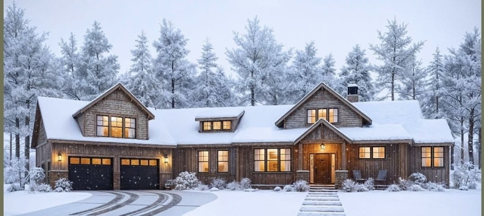 a modern rustic house in a snowy landscape the house has a sleek design with a light gray and stone exterior the roof is black steel and the front doors are black surrounding the house the snow appears soft and powdery white creating a serene atmosphere in the background tall evergreen trees and a rugged mountain are dusted with snow under a soft pastel blue sky with hints of warm peach and yellow from the rising or setting sun the overall atmosphere is tranquil and inviting with a peaceful winter morning glow