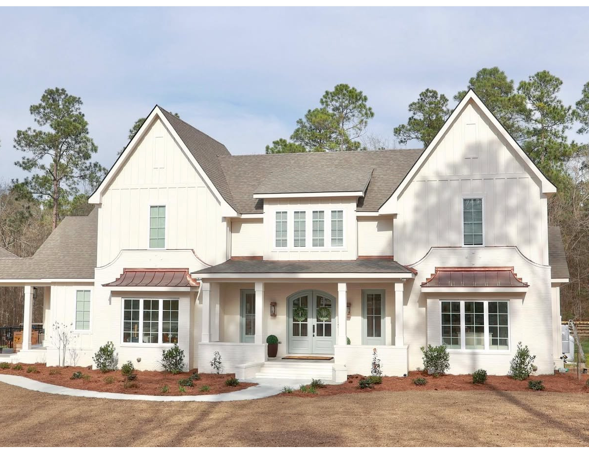 put black shutters on the top windows make the doors a pretty stained brown with a gold hardware add copper gutters add pretty landscaping add a grand manor shingle roof add chippendale railing to the front porch