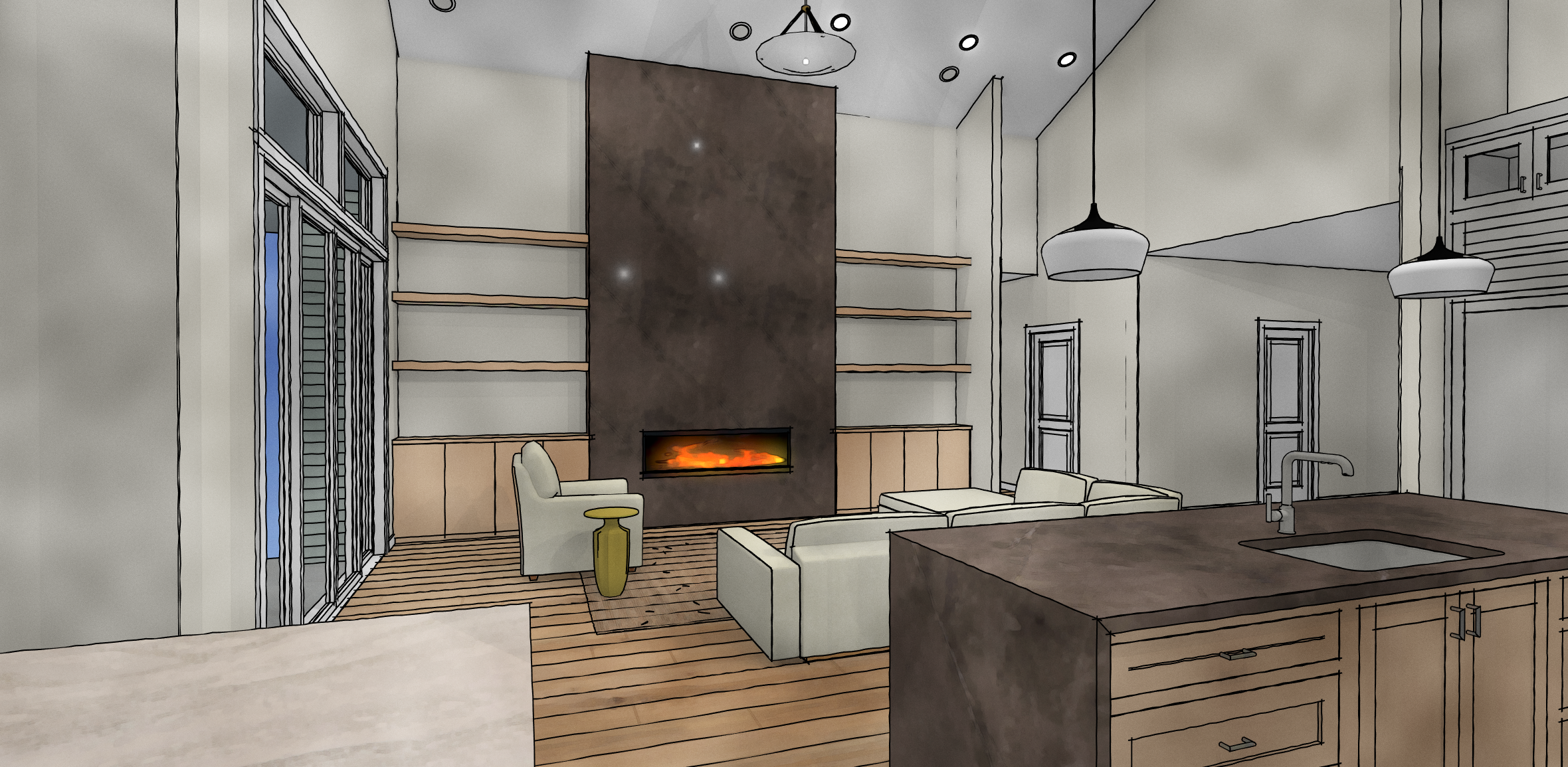 photorealistic render of this home off white walls fireplace large format natural stone slab cladding