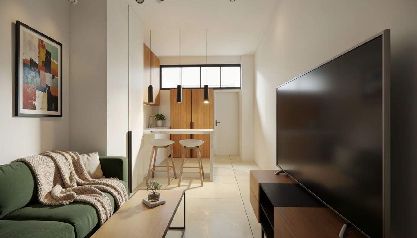 create a hyper realistic rendering interior shot of modern flat kitchen natural oak wood cabinets comfy sofa with throw artwork above sofa small modern textured rug tone should be relaxing and inviting the door leads to a bedroom