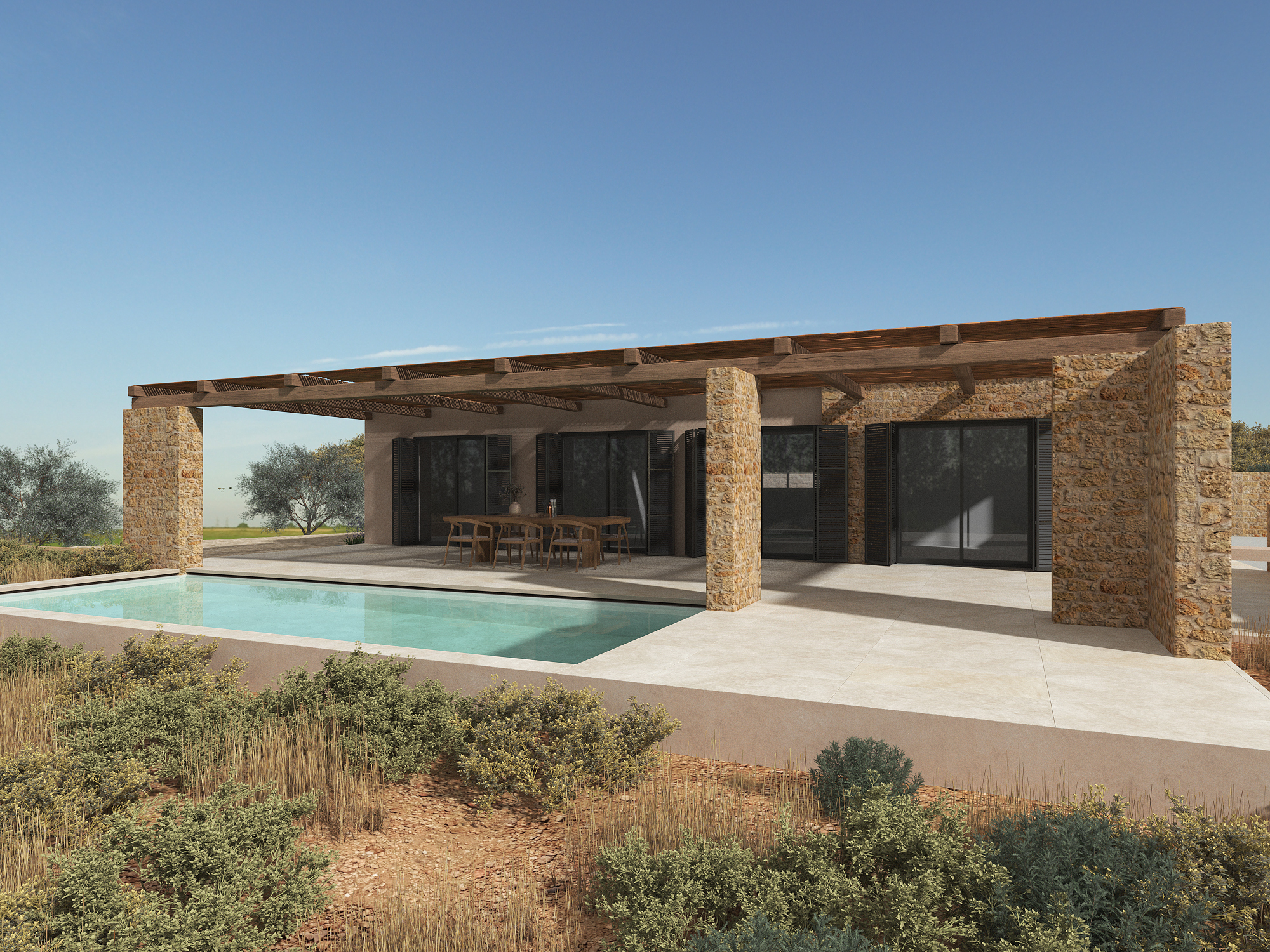 use the provided image as base do not change geometry proportions camera angle materials layout or existing elements additions add a minimal outdoor pool shower at the right side of the pool placed exactly in the corner between the two stone walls the shower is a simple stainless steel inox vertical pipe with a round head anchored on a small square base add a short wooden step platform natural oak matte slightly weathered under the shower in front of the shower on the right side of the pool deck add two minimal sun loungers sun loungers light wood frame with neutral fabric beige off white clean modern design aligned parallel to the pool edge lighting atmosphere warm morning sunlight around 9 30 10 00 am soft shadows slightly golden tone calm serene mediterranean atmosphere enhance realism of materials subtle reflections on water and glass no overexposure balanced contrast quality photorealistic ultra detailed 8k high dynamic range clean surfaces no noise no blur