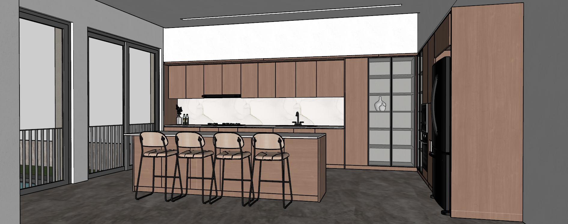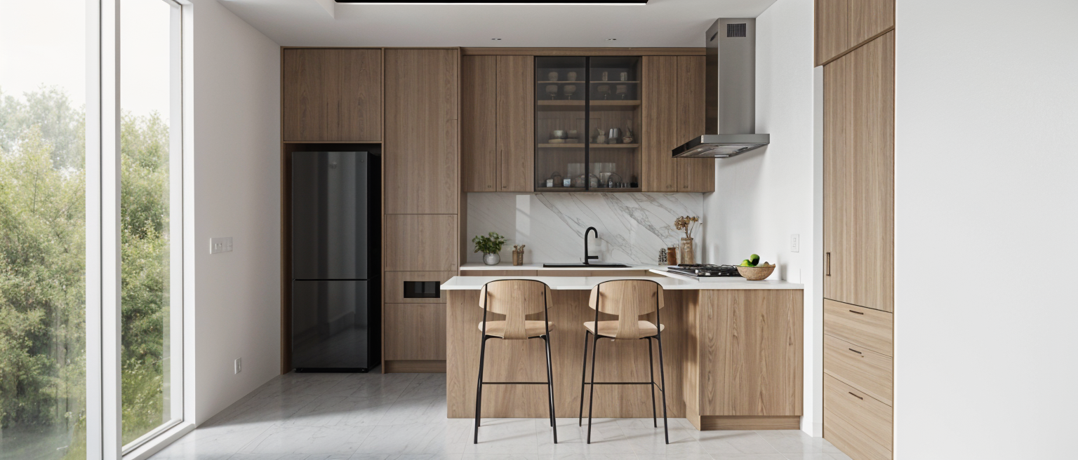 generate this image with this detail keep the existing cabinet design the accessories and layout exactly as it is but make the wood hpl texture on the cabinets more realistic and use the wood hpl color type of aica co id ak 14093 cy25 medium mode walnut apply simple modern finishes for the flooring looks clean and reflective and the wall white paint do not add new accessories or furniture only render the existing kitchen accessories as they are use bright indoor lighting with realistic reflections light source from above ceiling light the window on the left side brings in natural light and provides a green view create a bright room atmosphere with a realistic photorealistic finish 8k ultra detailed render make it more realistic make the outline smooth and realistic