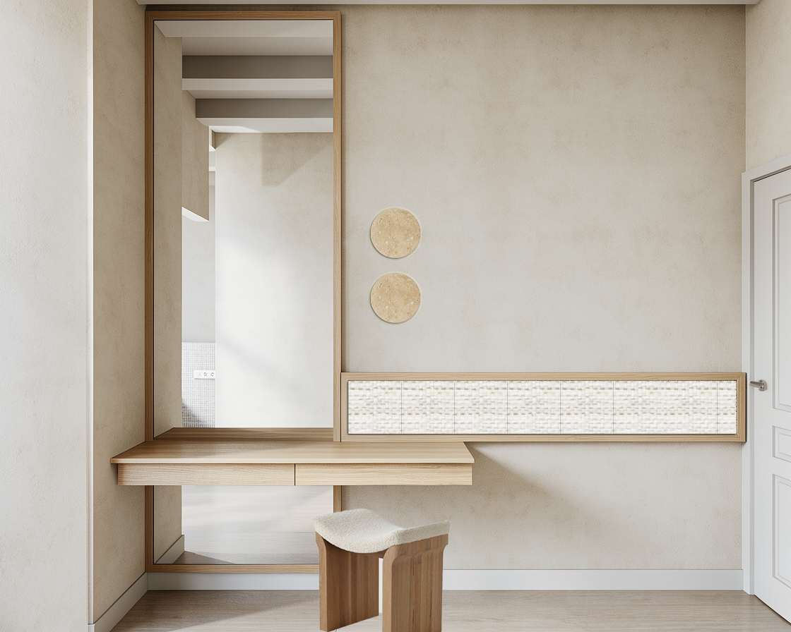 the round wall sconces are made of travertine stone indirect light create a realistic and professional render of a room with a calm and atmospheric the lighting should feel balanced and natural enhancing the realism of the materials
