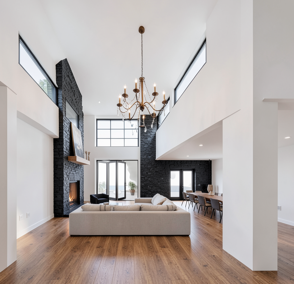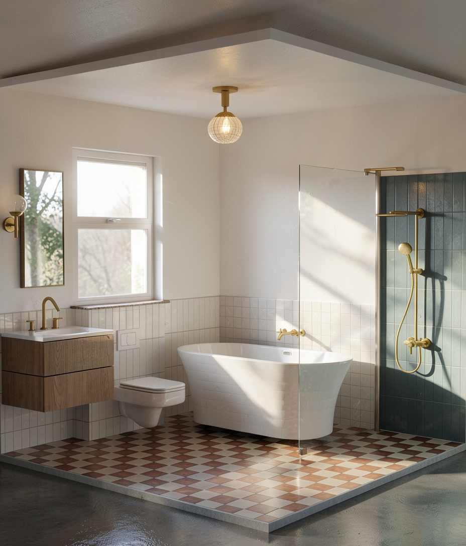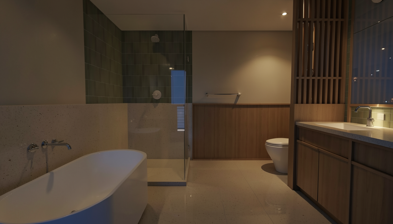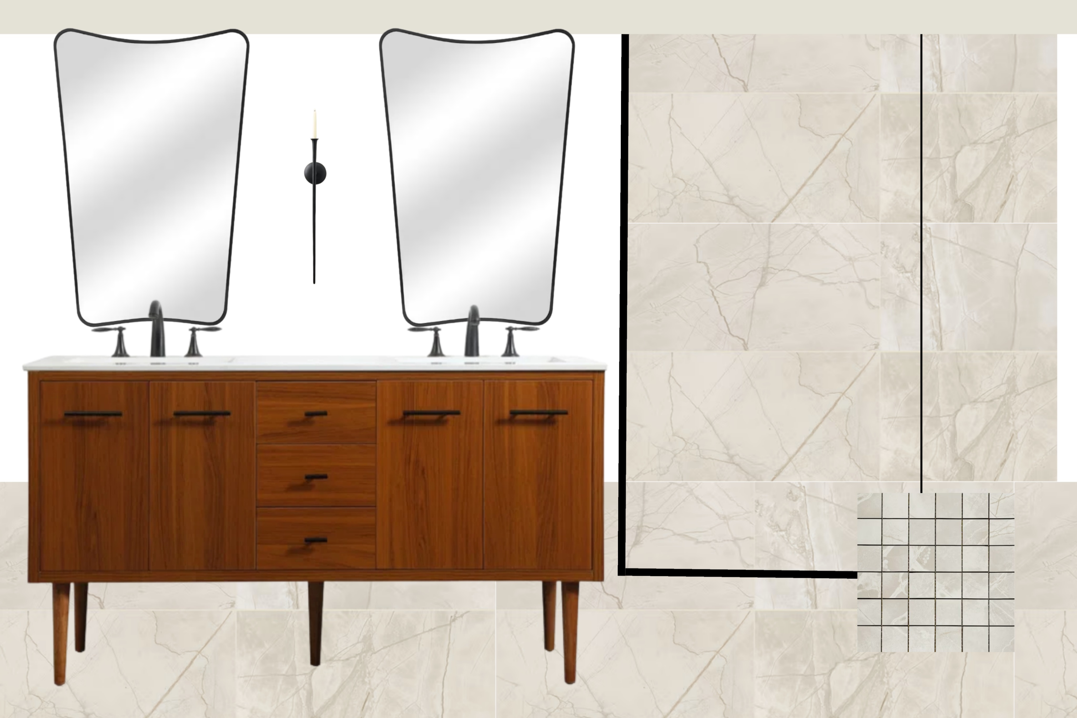 take this concept and turn it into a realistic rendering using same vanity and mirrors the tile is on the floor and the standing shower the vanity and the shower are horizontal against the back wall with an arched walkway between the sink area and the shower area