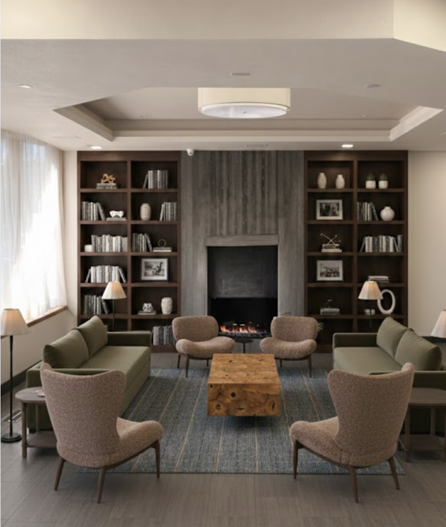 add led strip light to each of the bookcase shelves in 2700k warm light add dark hunter green to the ceiling alcove uplight the alcove give the room a warm afternoon diffused light and make all the textures come to life the velvet couches shearling chairs look like shearling the wingback chairs are linen illuminate the floor lights chandelier and exchange the bookcase items with more vintage industrial finds do not change any itemes except the ones i asked for keep every piece of furniture light fixtures the room scale proportion exactly as they are only make the changes i asked for thank you