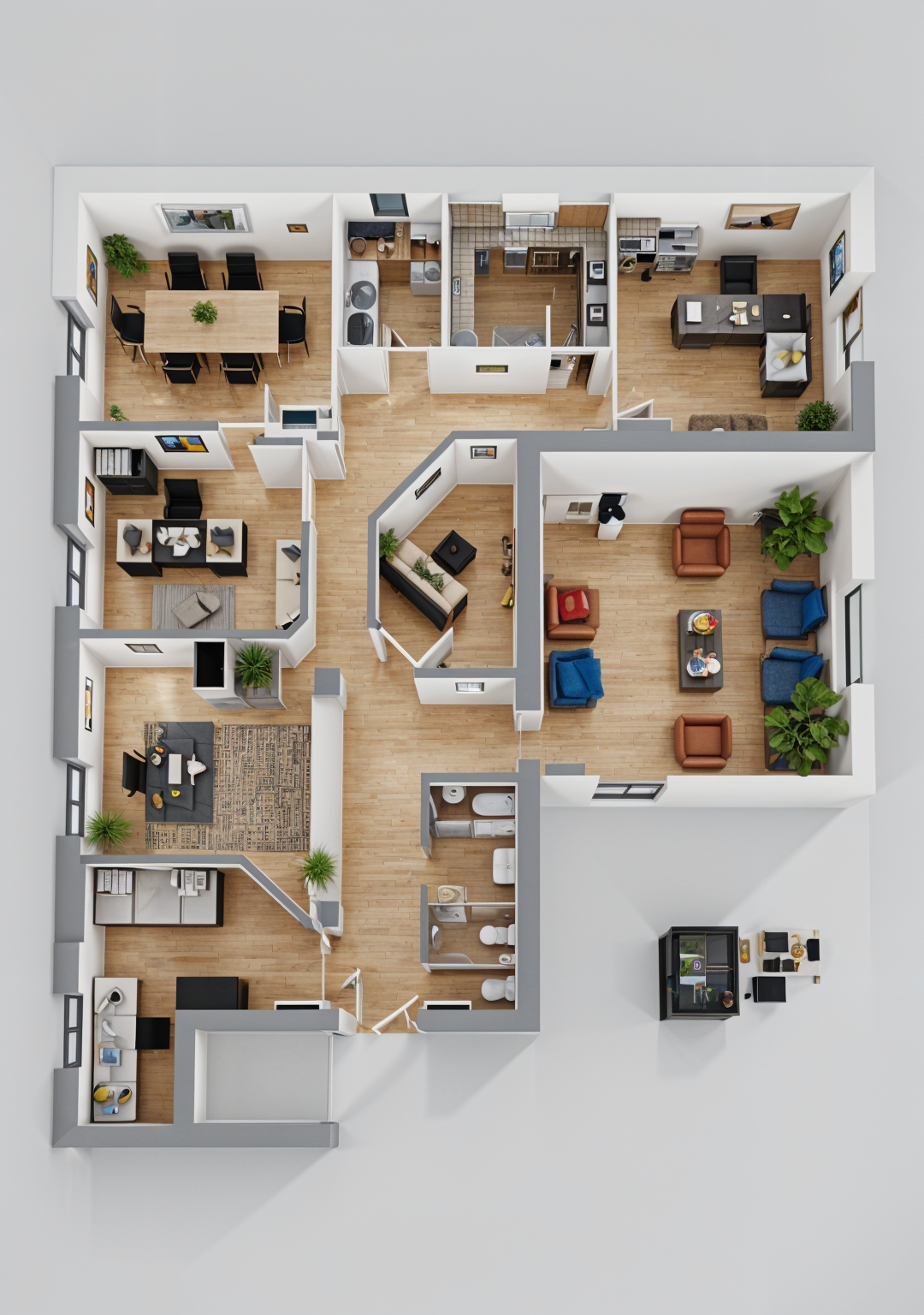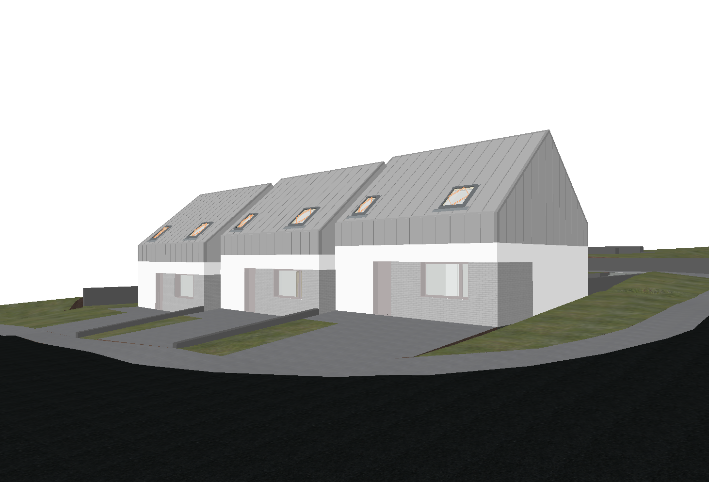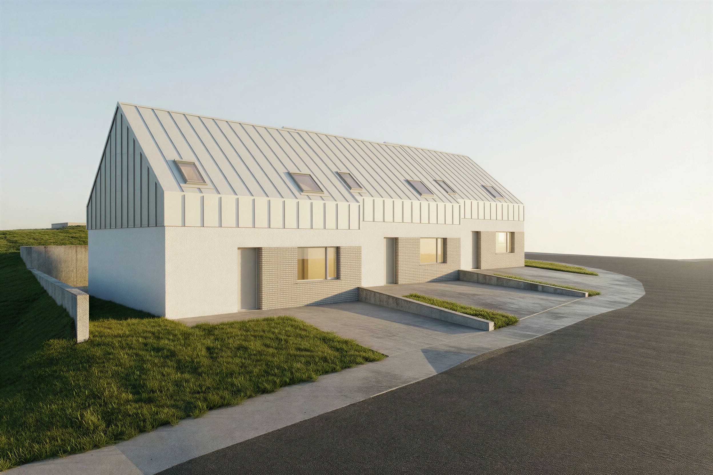 exterior shot transform this architectural model image into a realistic render while strictly preserving the existing building geometry layout and materials do not change the shape proportions or fa ade design of the houses add more brightness to the render