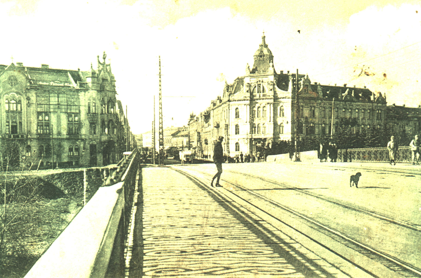 remove text from top of the picture beautyful clouds cinematic view 1900 s atmosphere black with white coloured box style tram more lenlighted hyperlight in the shadows