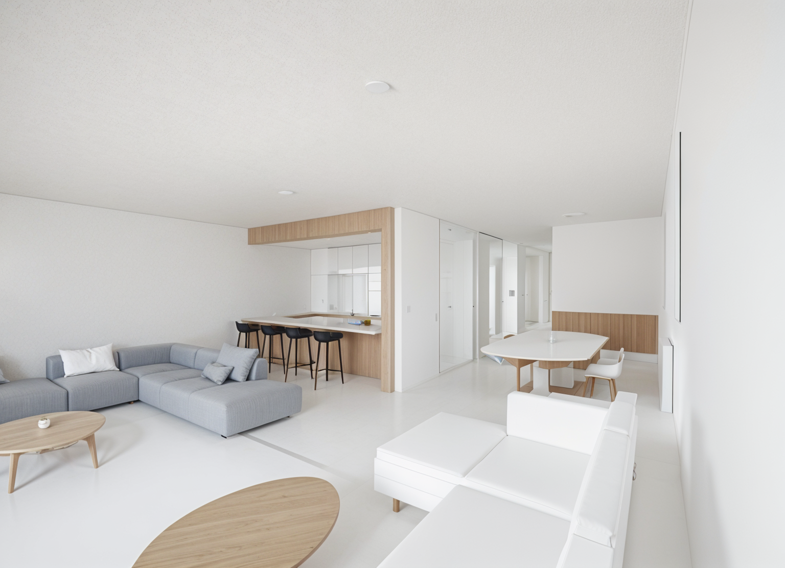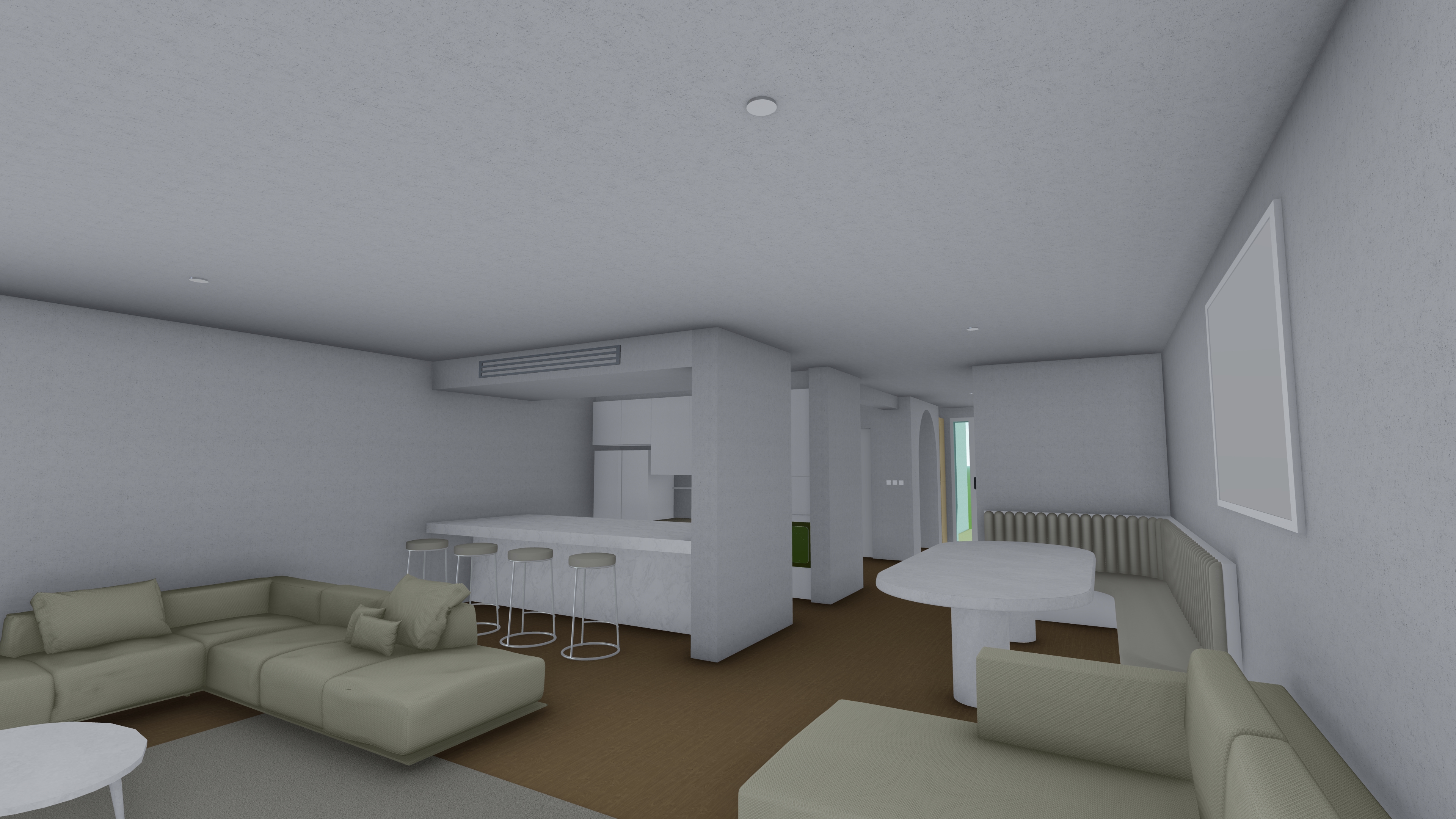perspective shot interior view of a serene bedroom on the left there is an armchair in a neutral fabric tone matching the bed in the center of the room which features a woven fabric headboard a framed artwork hangs on the white wall above to the right a built in white closet blends seamlessly with the space all walls are painted white the floor is made of natural wood and the ceiling is finished in smooth white plaster on the right side a recessed false ceiling houses a discreet air conditioning system the doors are in soft neutral tones and in the foreground on the right there is a desk with a computer completing the calm and functional atmosphere