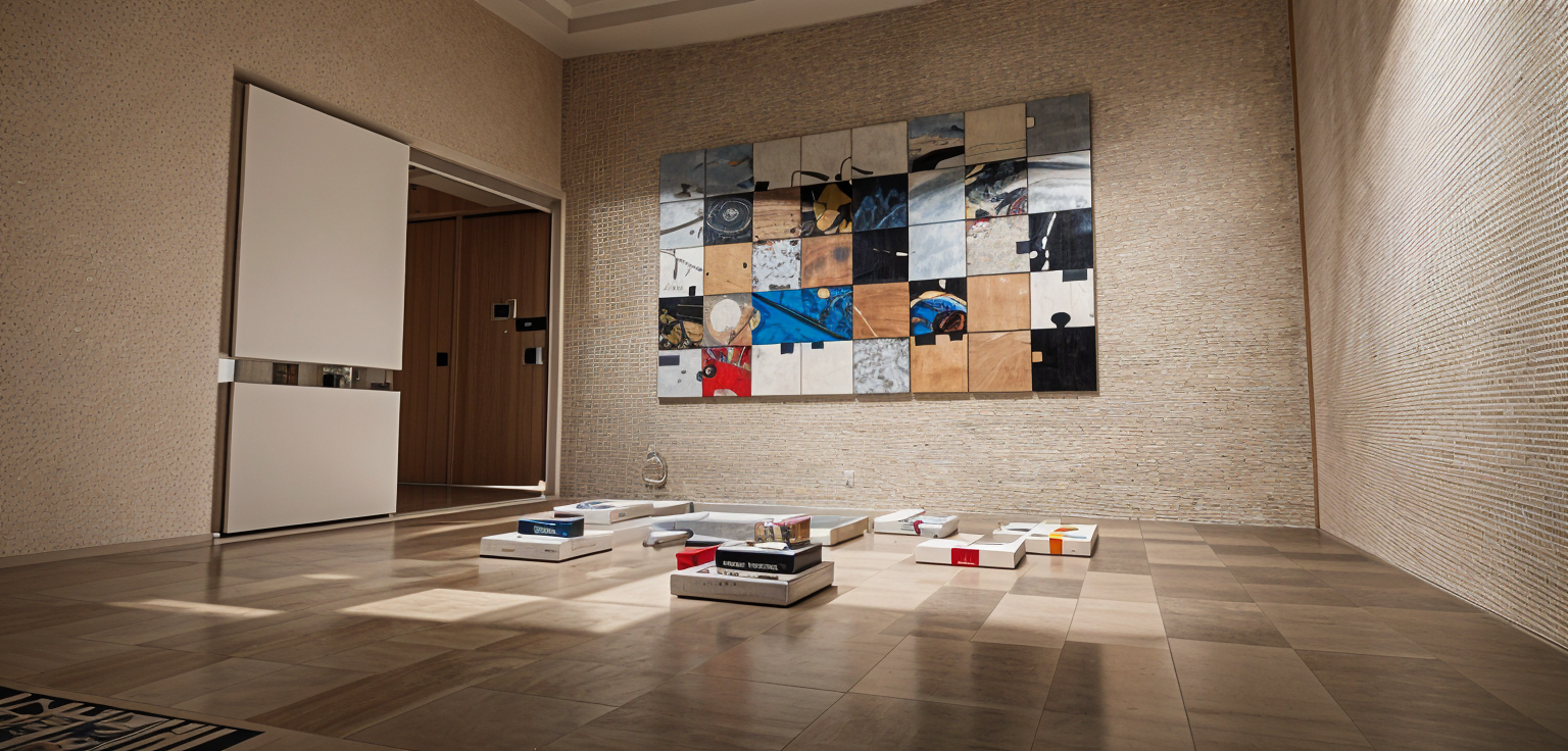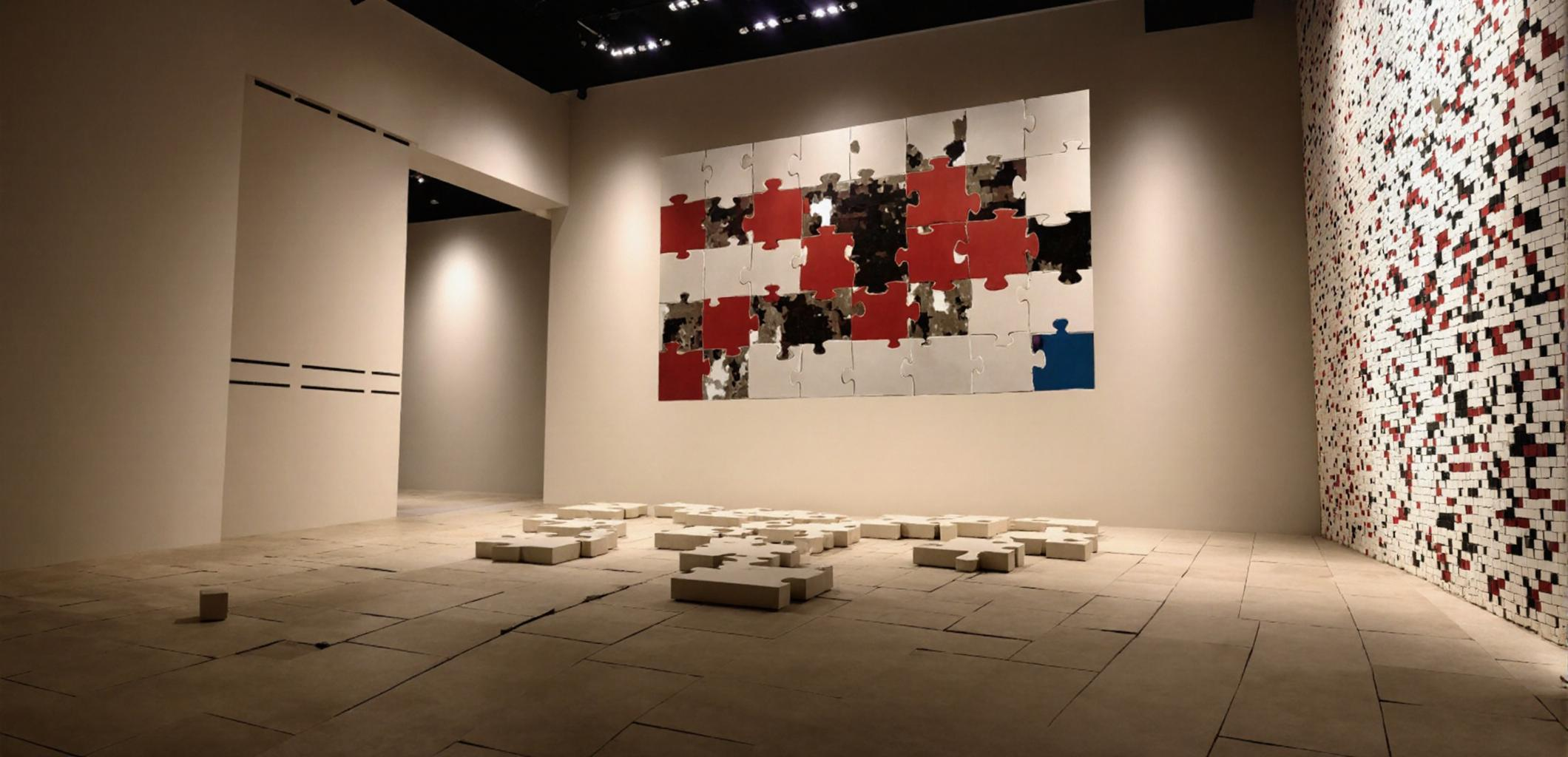 perspective shot installation features a large scale puzzle wall where oversized jigsaw pieces form a partially completed image some pieces are fixed vertically on the wall while others lie scattered on the floor creating a sense of incompletion and interaction the puzzle pieces display a collage of images textures and colours suggesting layers of cultural material or contextual references the work blurs the line between two dimensional composition and three dimensional spatial occupation inviting viewers to move around and mentally or physically piece the fragments together