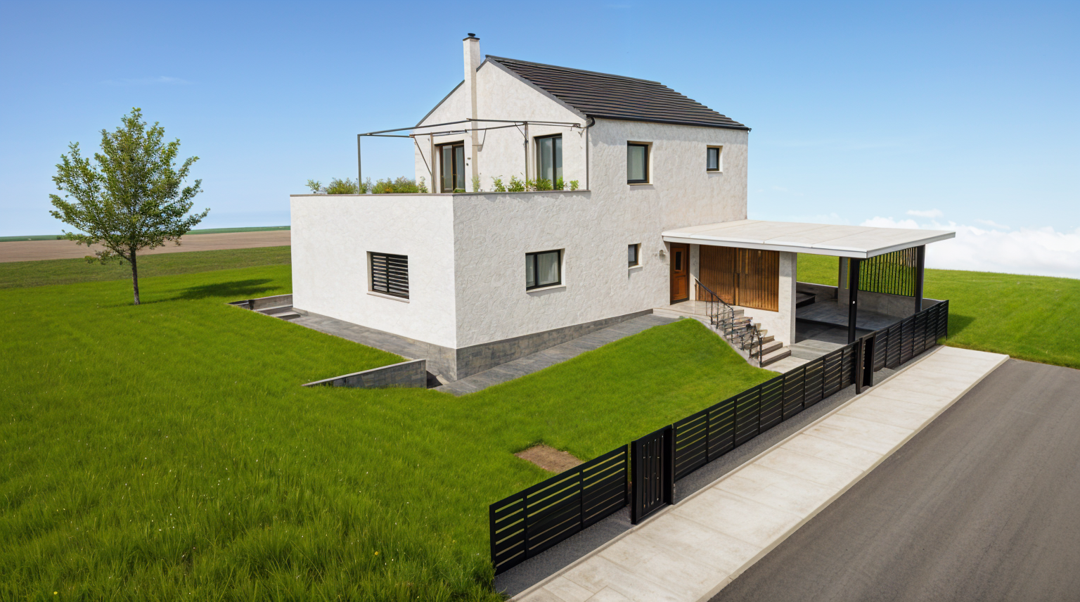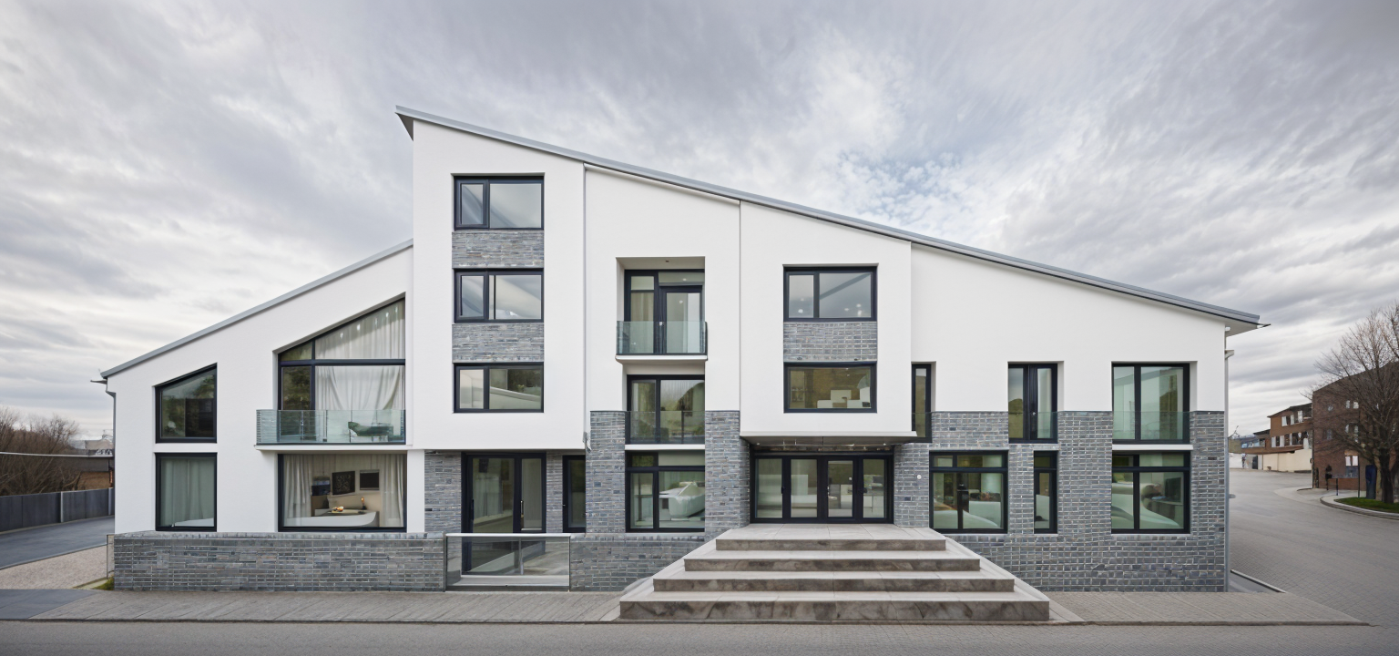 perspective shot modern apartment building with a sleek monochrome design the fa ade features grey and white accents with large geometric windows the roof is dark gray offering a contemporary touch the surrounding landscape is very suburban with vibrant greenery of the lush trees and well maintained grass in light green shades the atmosphere is bright and welcoming with soft natural lighting highlighting the architectural details a few people walk casually along the sidewalk and a modern car passes nearby complementing the urban setting architecture