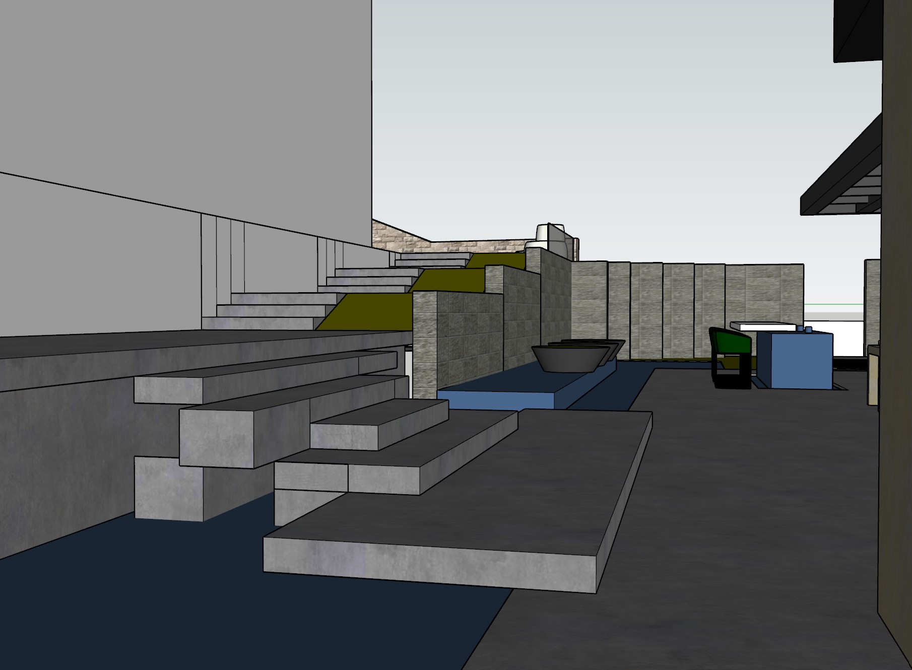 modernist exterior shot sunny day landscape design blue is water green is grass floor is concrete walls are dark grey stone cladding architecture