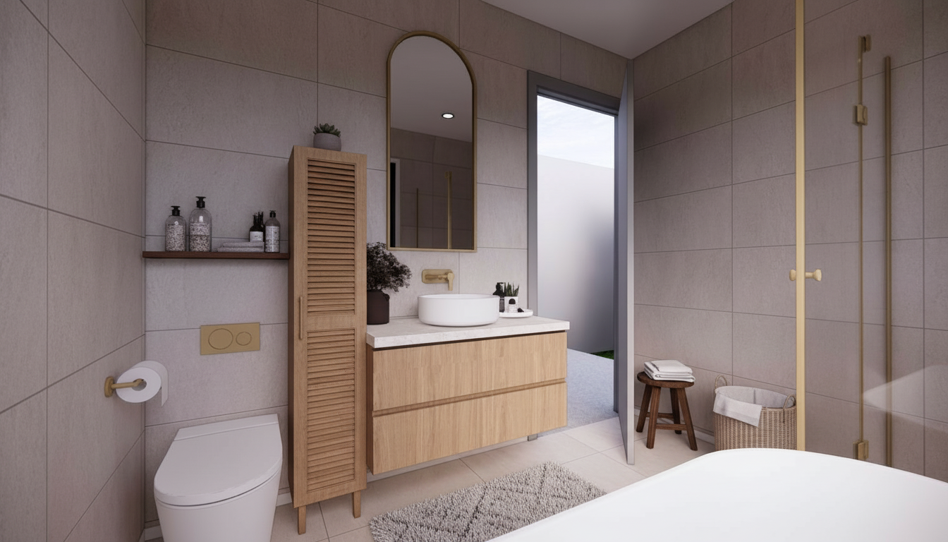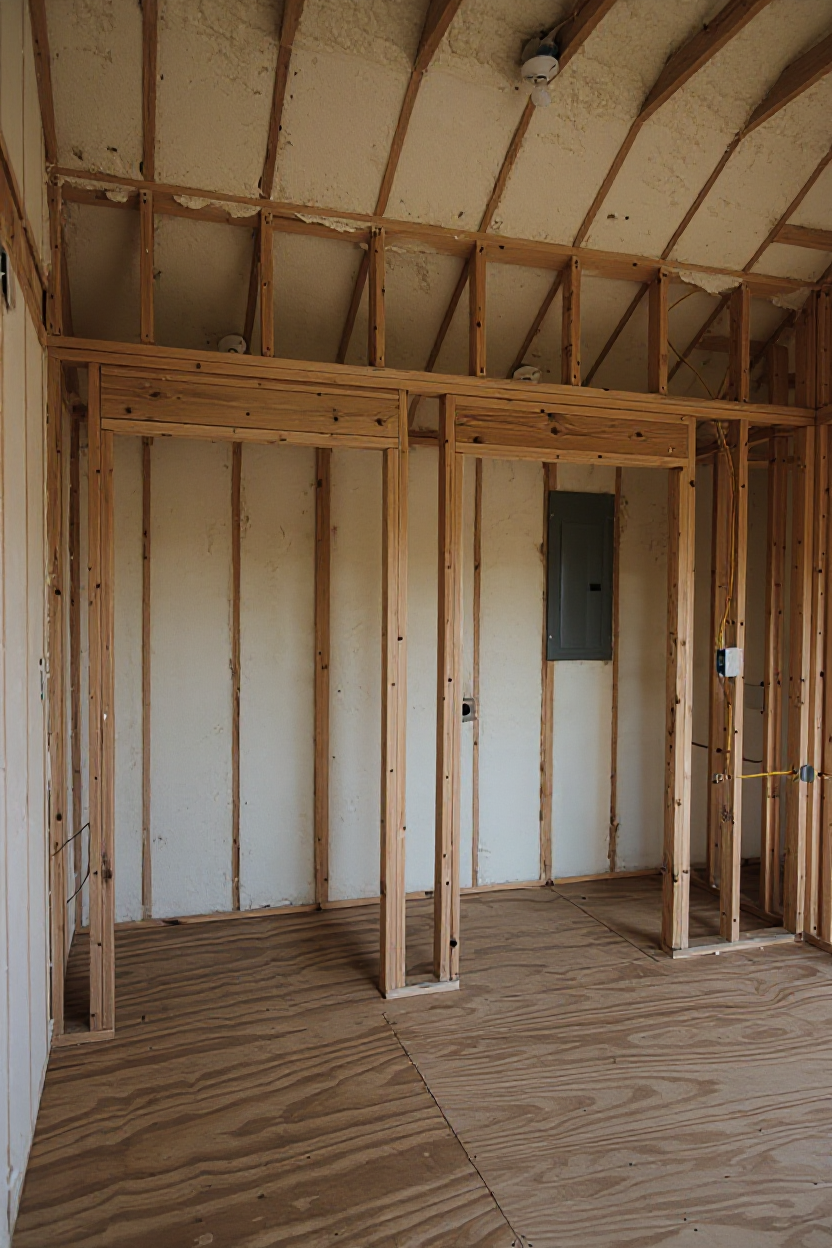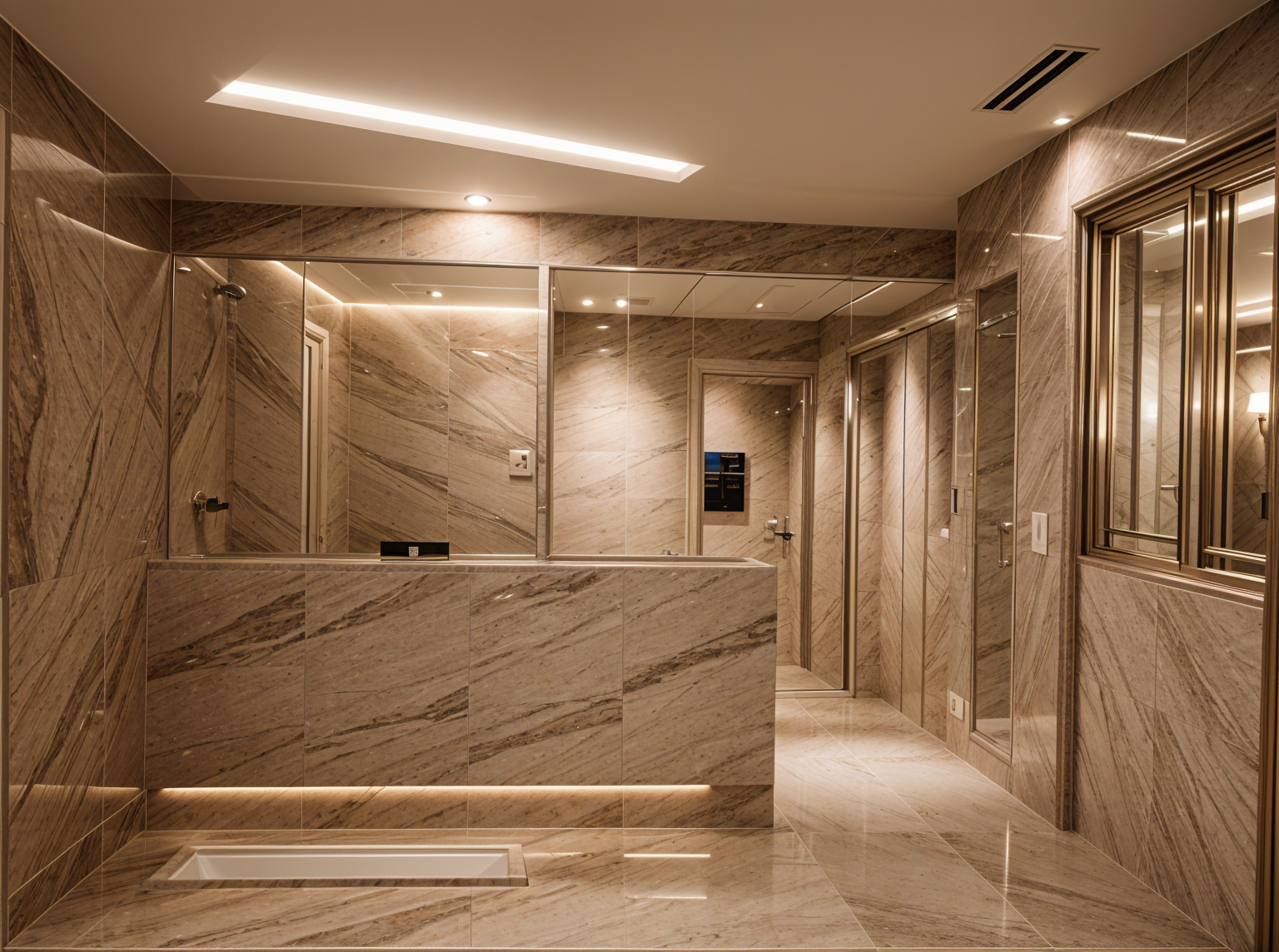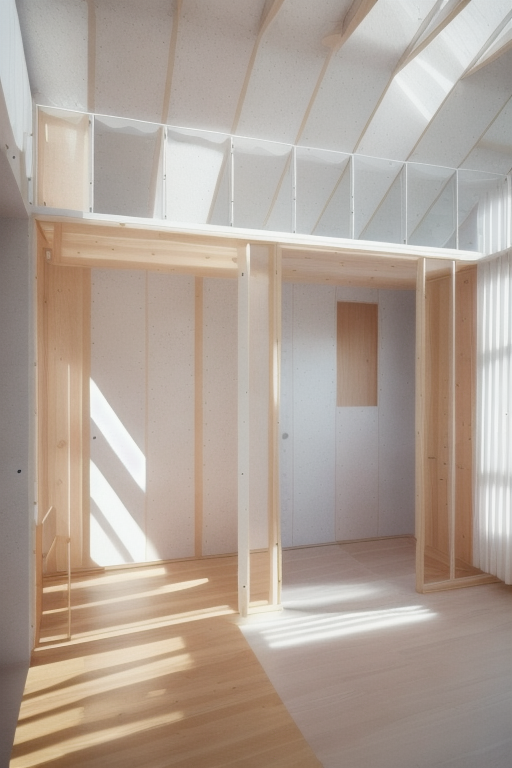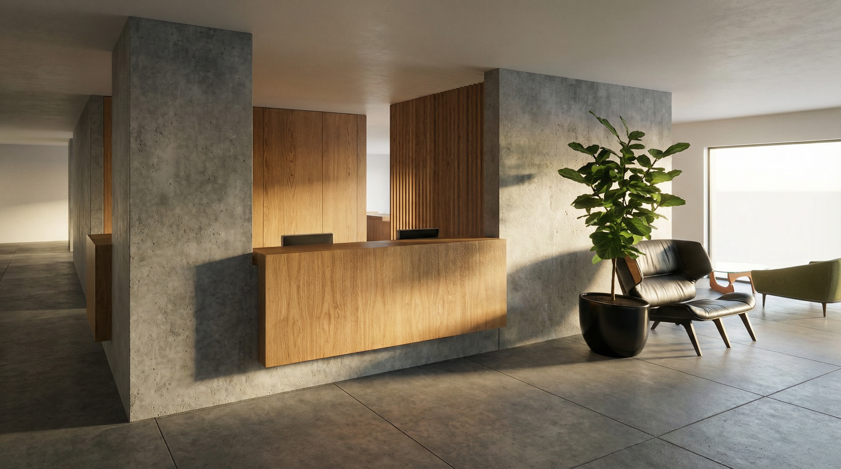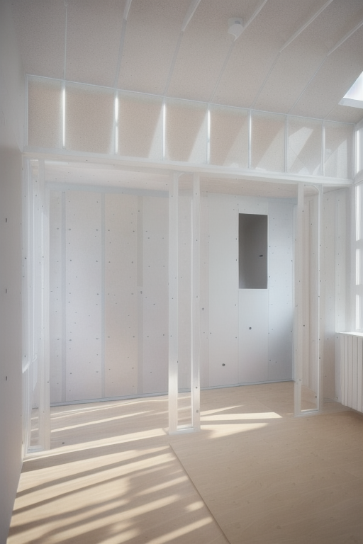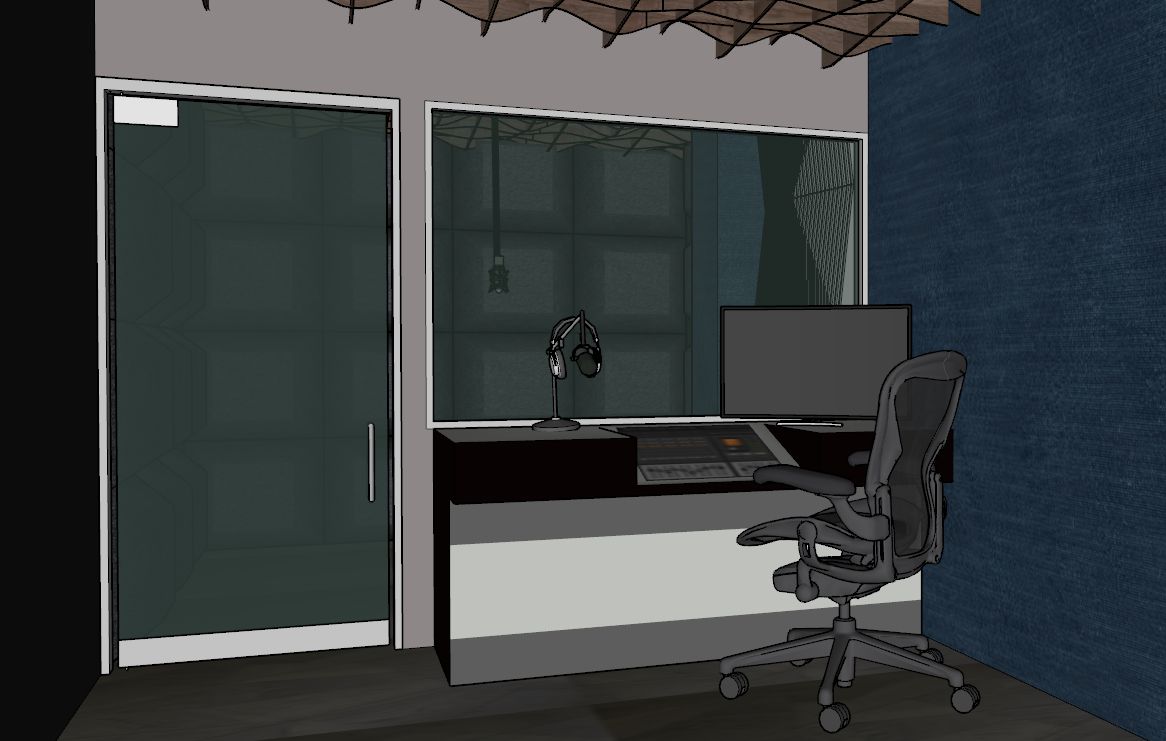 a hyper realistic interior rendering of a small professional audio recording studio control room a glass window separates the control room from the vocal booth in the vocal booth a ceiling mounted hanging microphone with a shock mount is visible in the control room there is a modern studio desk with a mixing console studio headphones on a stand a single computer monitor and an ergonomic desk chair soft acoustic wall panels dark wooden floor realistic lighting reflections on the glass subtle shadows and detailed textures photorealistic ultra detailed high dynamic range global illumination 8k