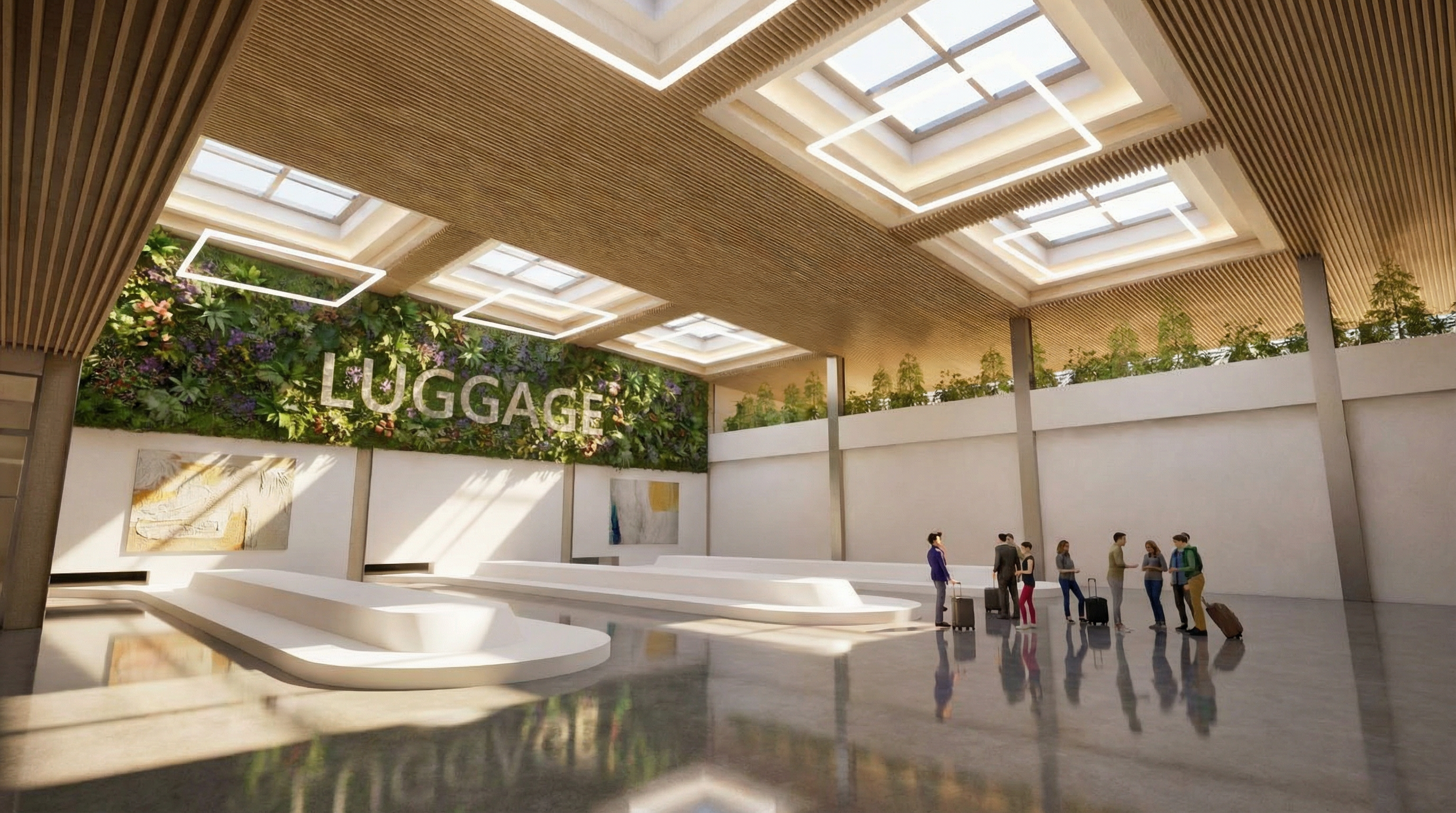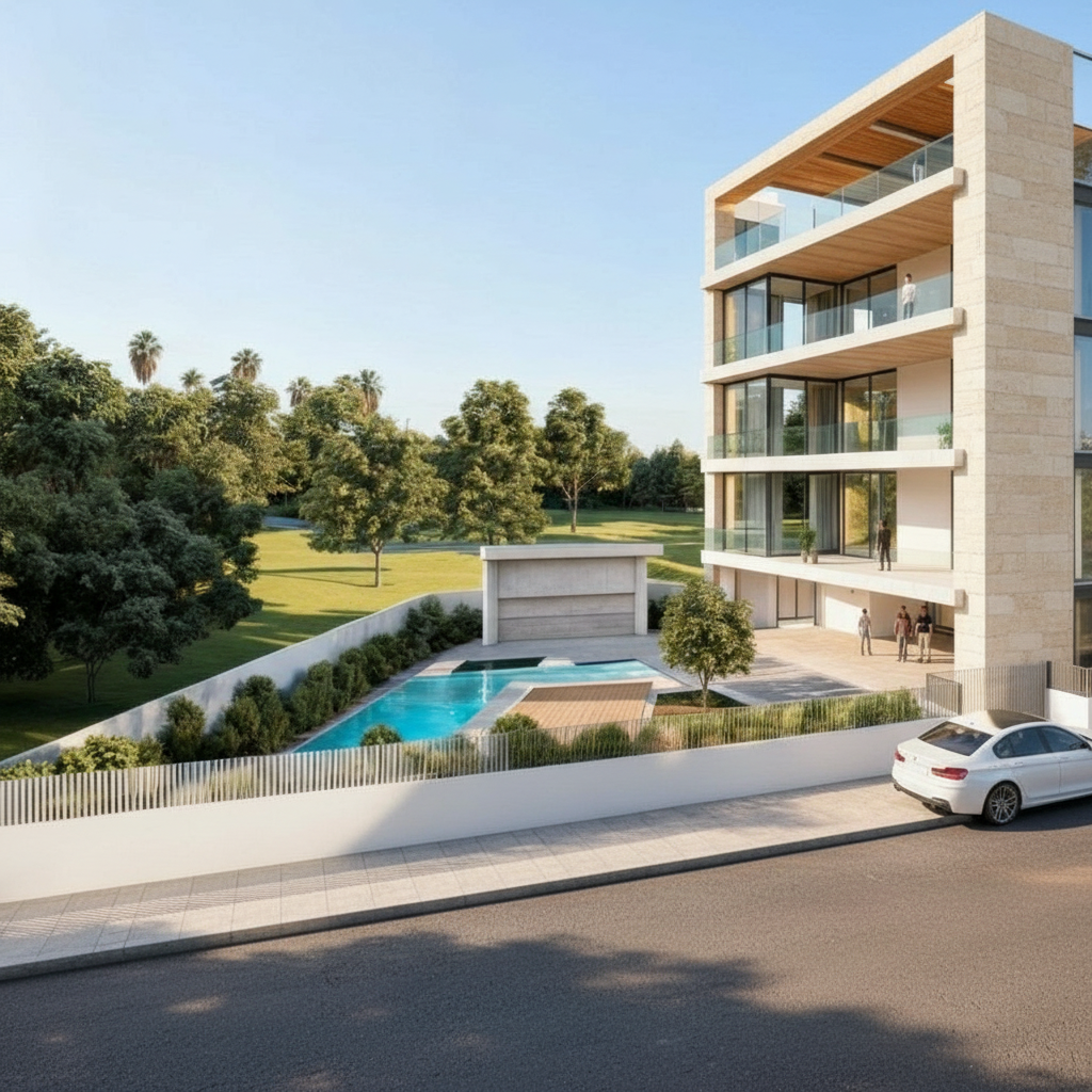 replace all existing beige stone fa ade surfaces with the uploaded travertine texture material use the uploaded texture exactly as the new fa ade material keep its natural warm beige color soft variation and matte finish do not change the color tone or saturation avoid visible tiling or repetition make the texture seamless scale the texture proportionally to large architectural panels not small tiles keep grout lines minimal and subtle application apply the new stone texture only to the fa ade areas that previously had beige stone do not distort or stretch the texture align panels naturally and evenly across all floors lighting maintain bright soft daylight with no harsh shadows so the stone reads clearly restrictions do not modify the building geometry do not change any other materials glass white plaster metal panels concrete do not change the environment or camera angle only replace the beige fa ade stone with the uploaded travertine texture do not change anything except this texture