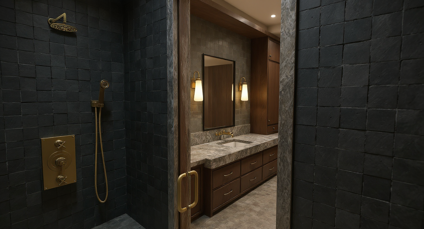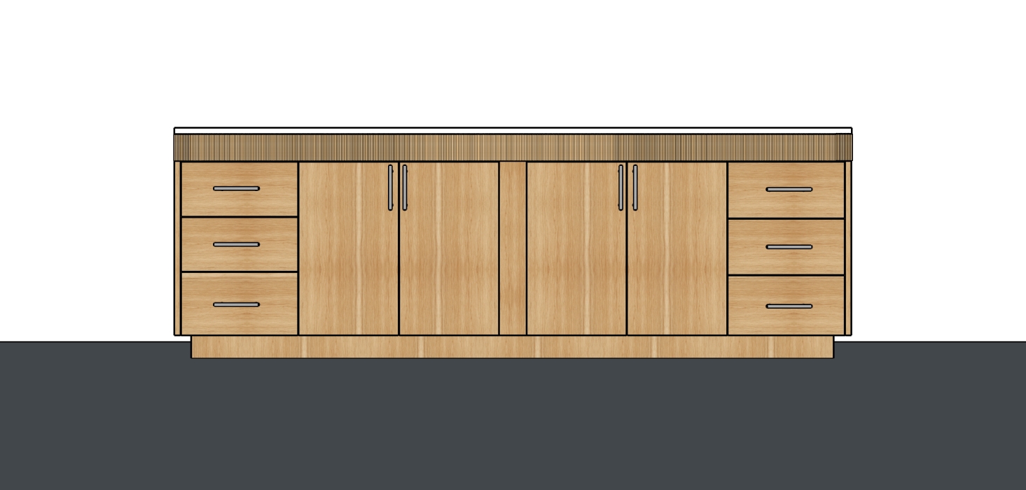 photo realistic render of this bathroom vanity with tambour detail add two sinks above the middle two cabinets with matching wall mounted faucets
