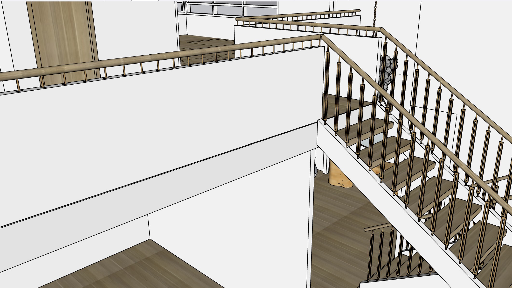 create photorealistic rendering of this stairway add 36 circular window showing bottom side 1 2 on far right upper side of the wall with white trim clear glass at appx 15 centered in tall back wall going up stairs keep handrail light white oak floors light white oak and stair spindles champagne bronze metal posts keep spindle designs as is add eucalyptus trees and landscaping in windows keep white painted stair and floor stringer keep stairs light oak