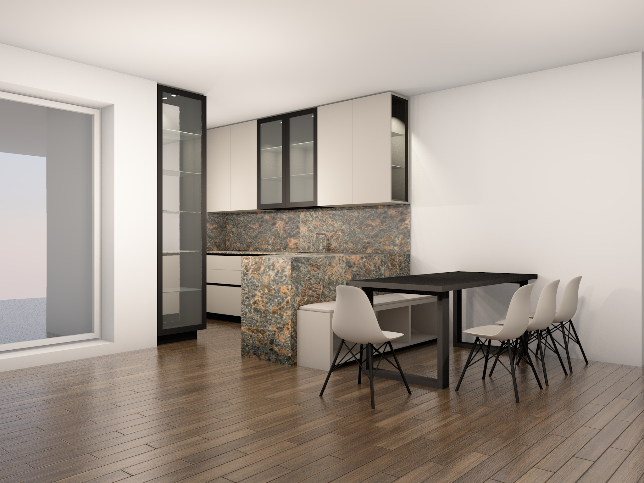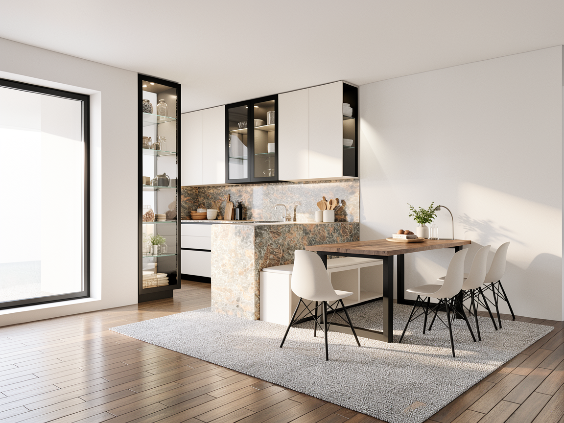 soft white modern kitchen kitchen realistic render high detailed add kitchen accesories black frame of the glass cabinets glass inner shelves mirror on the end of glass cabinets add e no texture beige rug under the dinning table