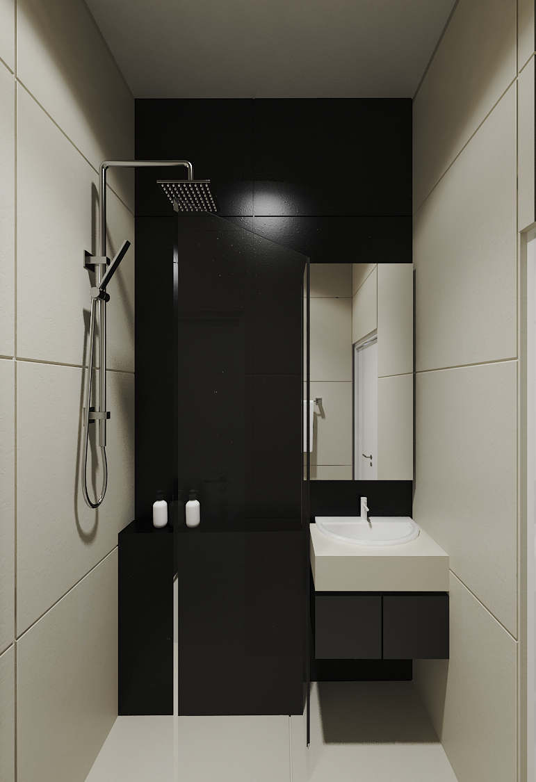 tambahkan motif marmer sedikit pada keramik hitam dan tambahkan indirect lighting di atas dan bawah cermin
