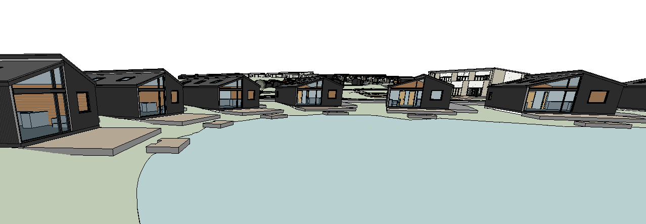 create a realistic render of a modern luxury lodge style home holiday park set in the english countryside with black timber clad lodges with light landscaping around them there should be a small timber deck that extends to the edge of the water for each lodge and deck chairs on the timber decking