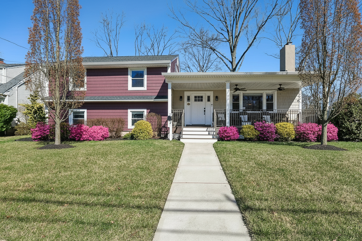 partly cloudy sky some deciduous trees in background add gutters and downspouts