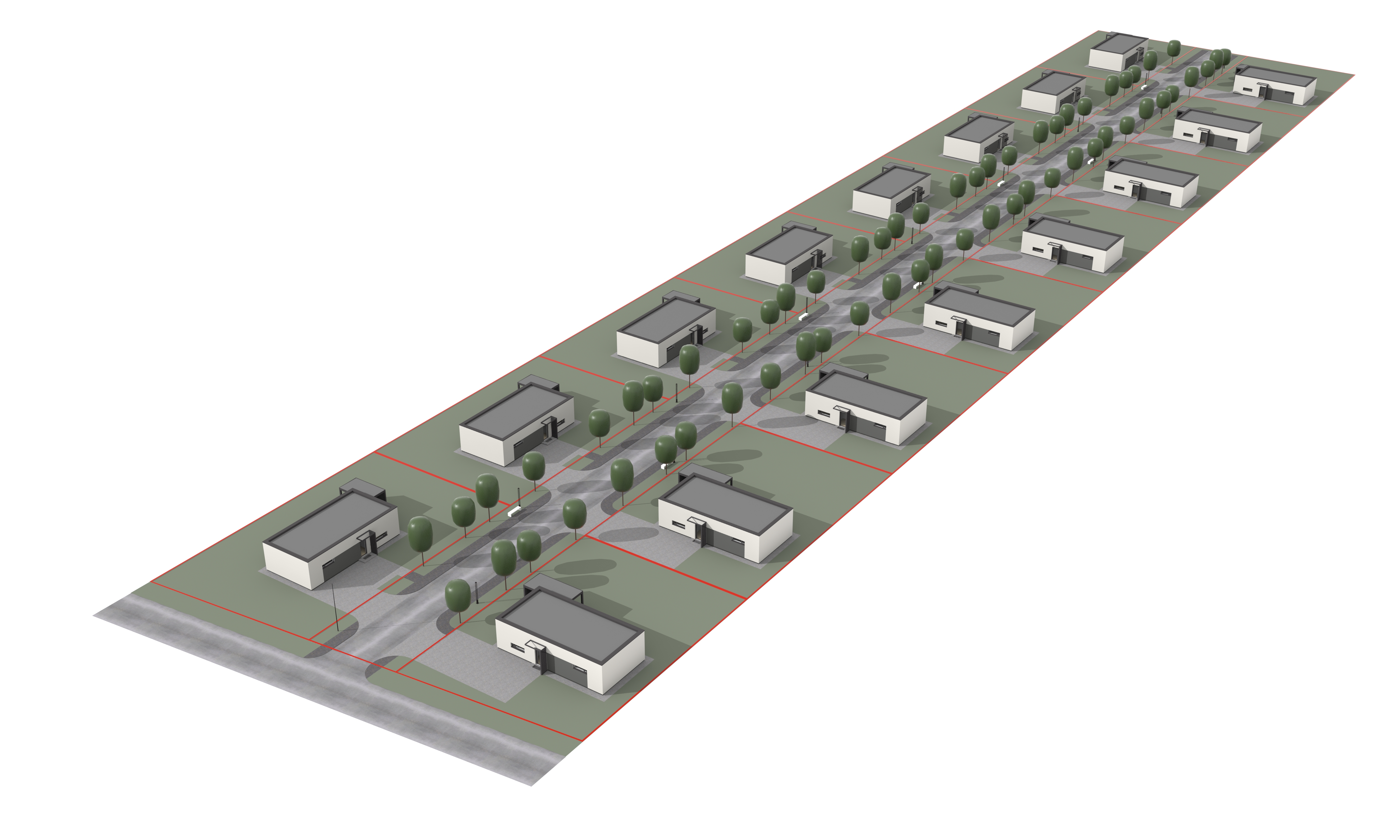 keep the same aerial view of a modern suburban neighborhood featuring rows of minimalist white and grey plaster houses with flat gray bitumen roofs and len to without wall next to it some of the roofs have solar panels installed the houses are neatly aligned each surrounded by lush green lawns and separated by elegant red boundary lines change red line to dark grey metal wire fences building height scots pine line the gray asphalt roads and grey and dark grey paving adding a natural touch to the geometric layout there are no trees in the borders of the picture the scene is bathed in soft warm sunlight creating a serene and harmonious atmosphere