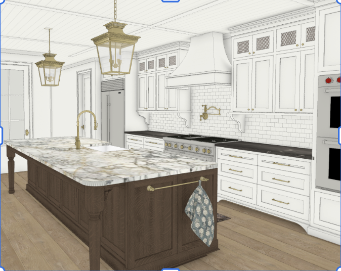 render this in a photo realistic way keeping the exact materials the backplash tile should be white with white grout the island should be a dark cherry walnut