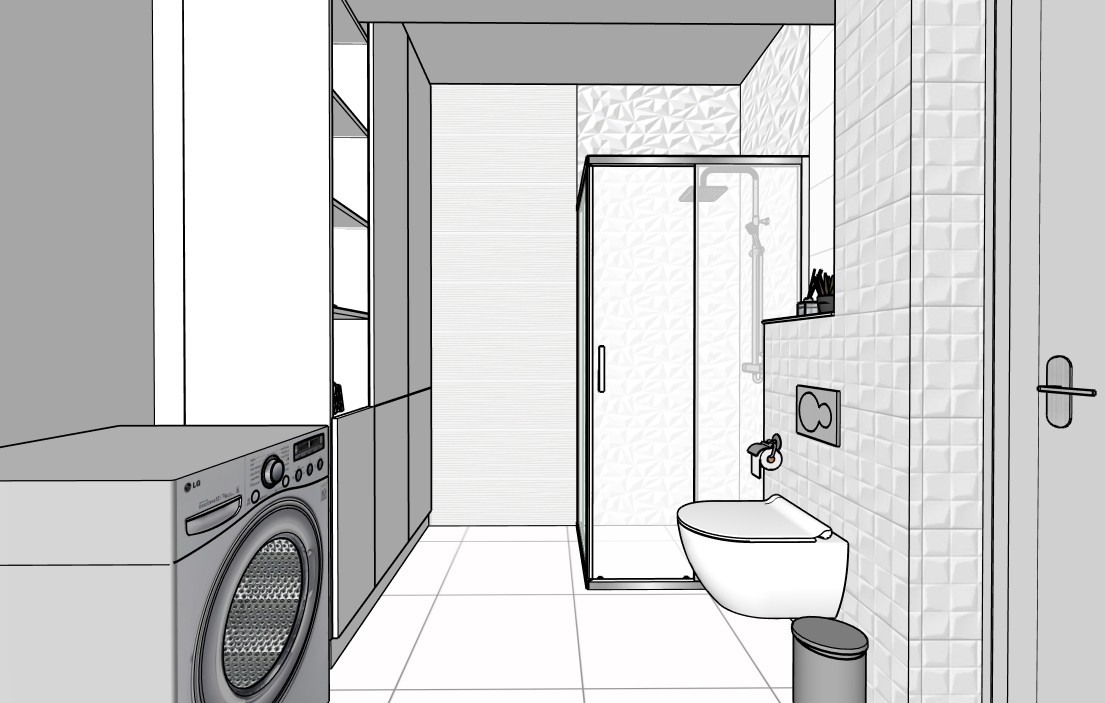 wall materials critical must match references and sketch hatching exactly front wall behind laundry area apply white ceramic tiles with horizontal linear wave texture fine parallel grooves running horizontally across the surface creating subtle rippled striations with matte finish this corresponds to the horizontal hatching lines in the architectural sketch shower enclosure interior walls cover with white tiles featuring 3d geometric triangular faceted pattern sharp origami like angular relief creating crystalline surfaces with dramatic dimensional depth each section displays irregular triangular shapes protruding at different angles matching the triangular hatching pattern shown in the sketch interior right wall toilet area and entrance install square beveled tiles with pillowed 3d effect small white tiles arranged in precise grid pattern each with raised cushioned center and beveled edges creating quilted appearance semi gloss finish with subtle shadows emphasizing relief structure corresponding to the square grid hatching in the sketch layout and key elements left side foreground front loading lg washing machine in silver gray finish positioned under or adjacent to built in cabinetry system tall white storage unit with combination of closed lower cabinets flat handleless doors and open upper shelving niches for organized storage center straight ahead rectangular glass shower enclosure with clear glass panels and slim chrome metal frame chrome shower column with overhead rain shower head visible on interior wall white tiled shower floor matching main bathroom tiles right side wall hung white modern toilet with concealed cistern mounted on textured pillowed tile wall rectangular gray dual flush plate integrated into wall small chrome toilet paper holder mounted beside toilet cylindrical gray waste bin positioned on floor simple white interior door with modern chrome lever handle visible on far right edge